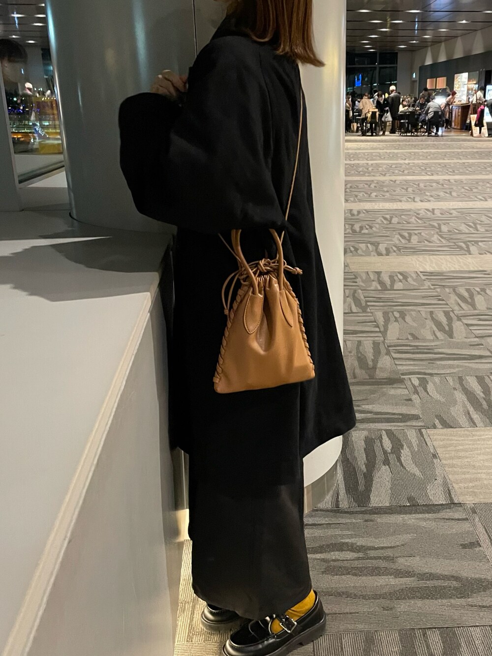 ブラックコーデに差し色でブラウンと黄色を組み合わせたコーデ