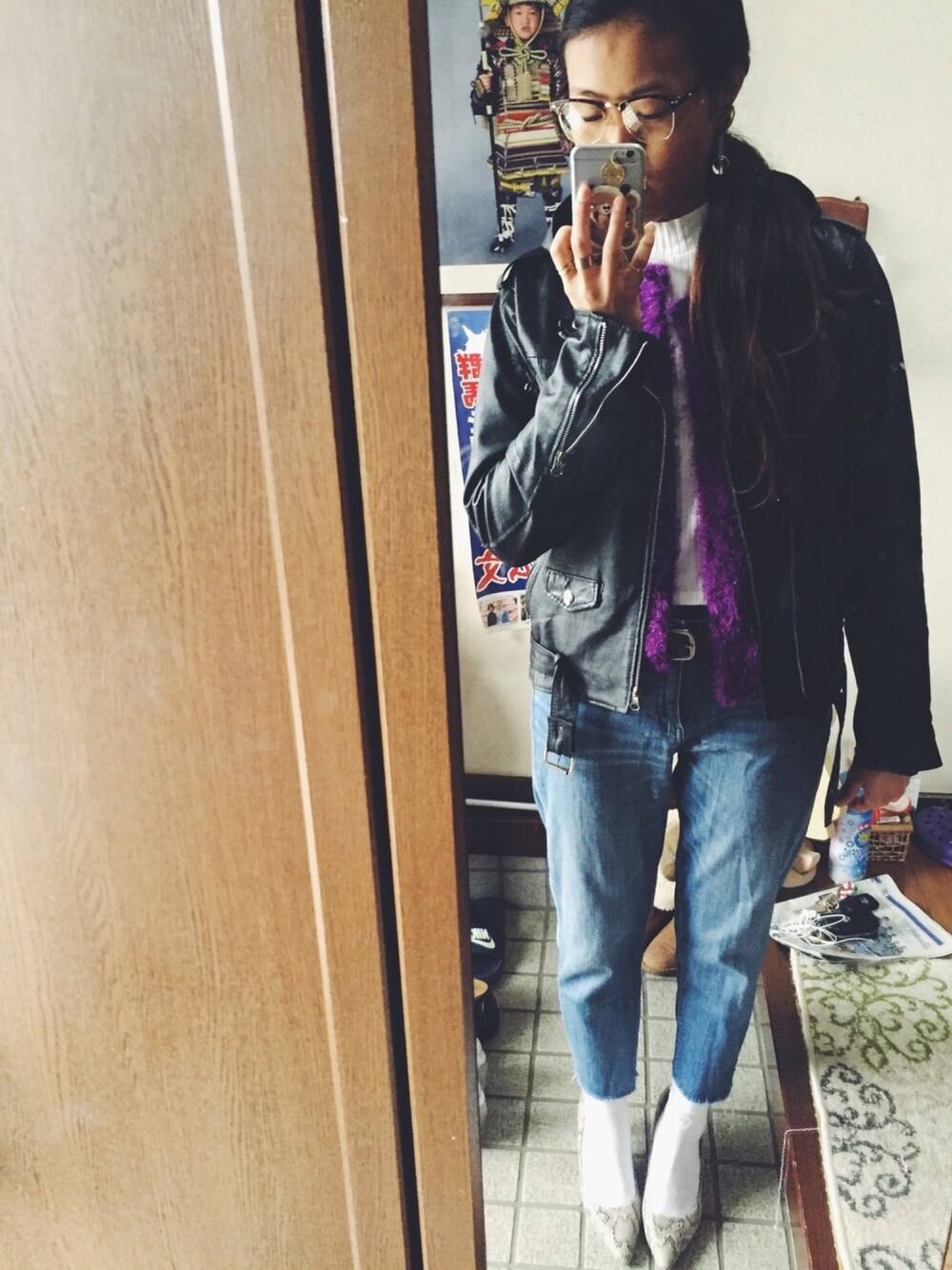 お気に入りのカーディガン ❣😎 zozoで見つけて悩んでるうちに売り切れて でも欲しいから楽天で買ったもの!笑 青よりの紫色がお気に入り〜〜 👍🏾 パンプスはだいすきなパイソン柄〜〜 楽天のやつでめっちゃ履きやすい!