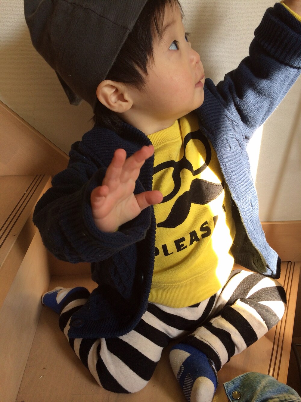 NEXT 紺色 カウチン アメアパ 帽子 いつもモノトーンが多いので原色の黄色のトレーナーが新鮮(*^_^*) 子供にはもっと明るい色の服を着せていこう