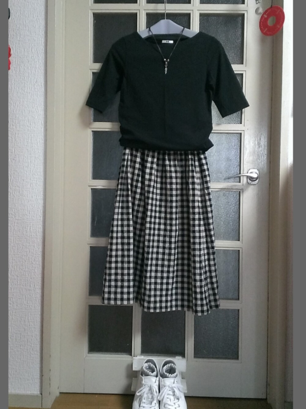 ボートネックTシャツ:ユニクロ スカート:ハンドメイド スニーカー:MUJI ウォーキングスタイル…何故かスカート。