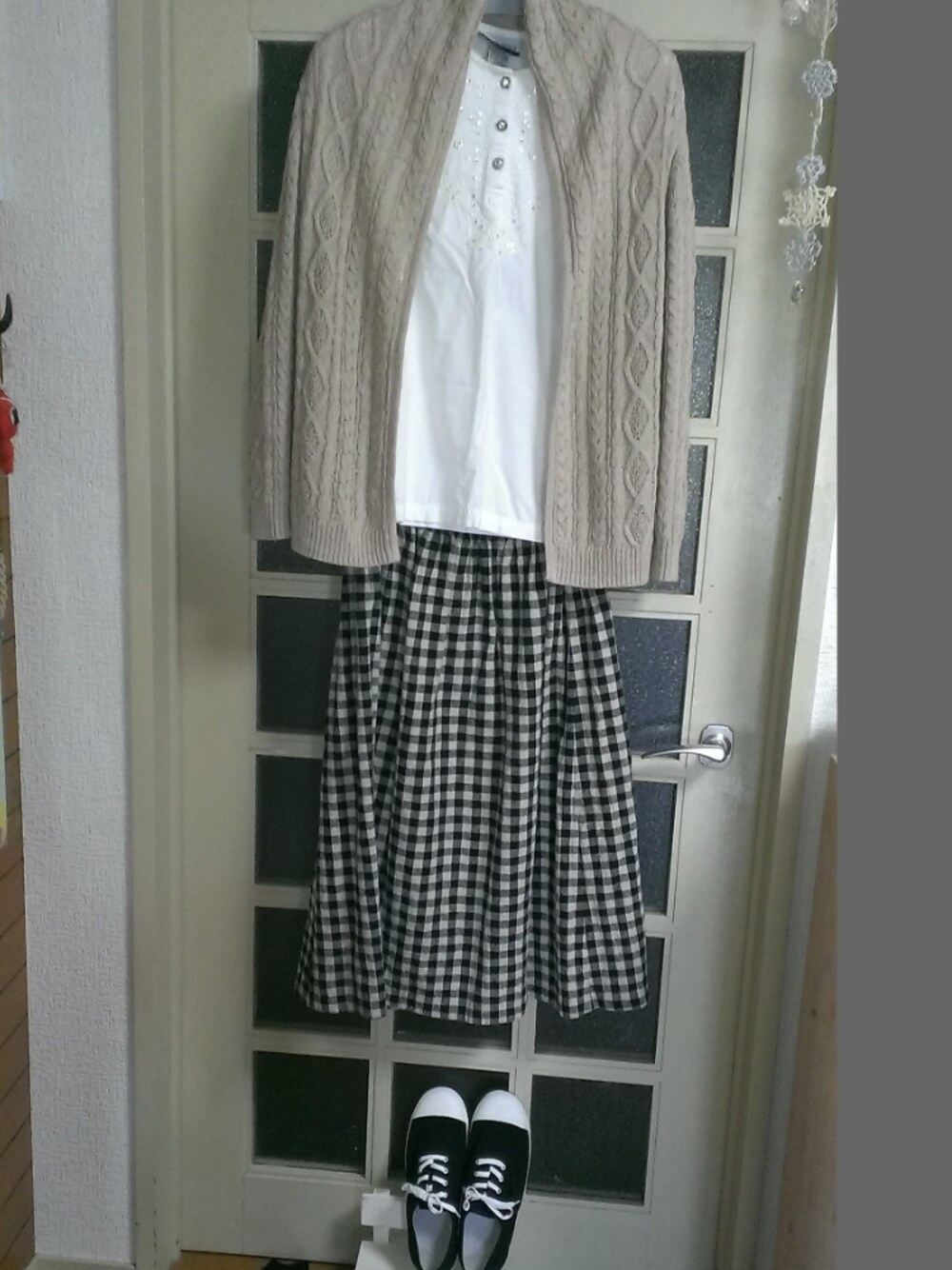 カーディガン:MUJI ブラウス:古着 スカート:ハンドメイド スニーカー:MUJI 初めての投稿です 写真には写らなかったけれど、黒色のソックスを履きました。