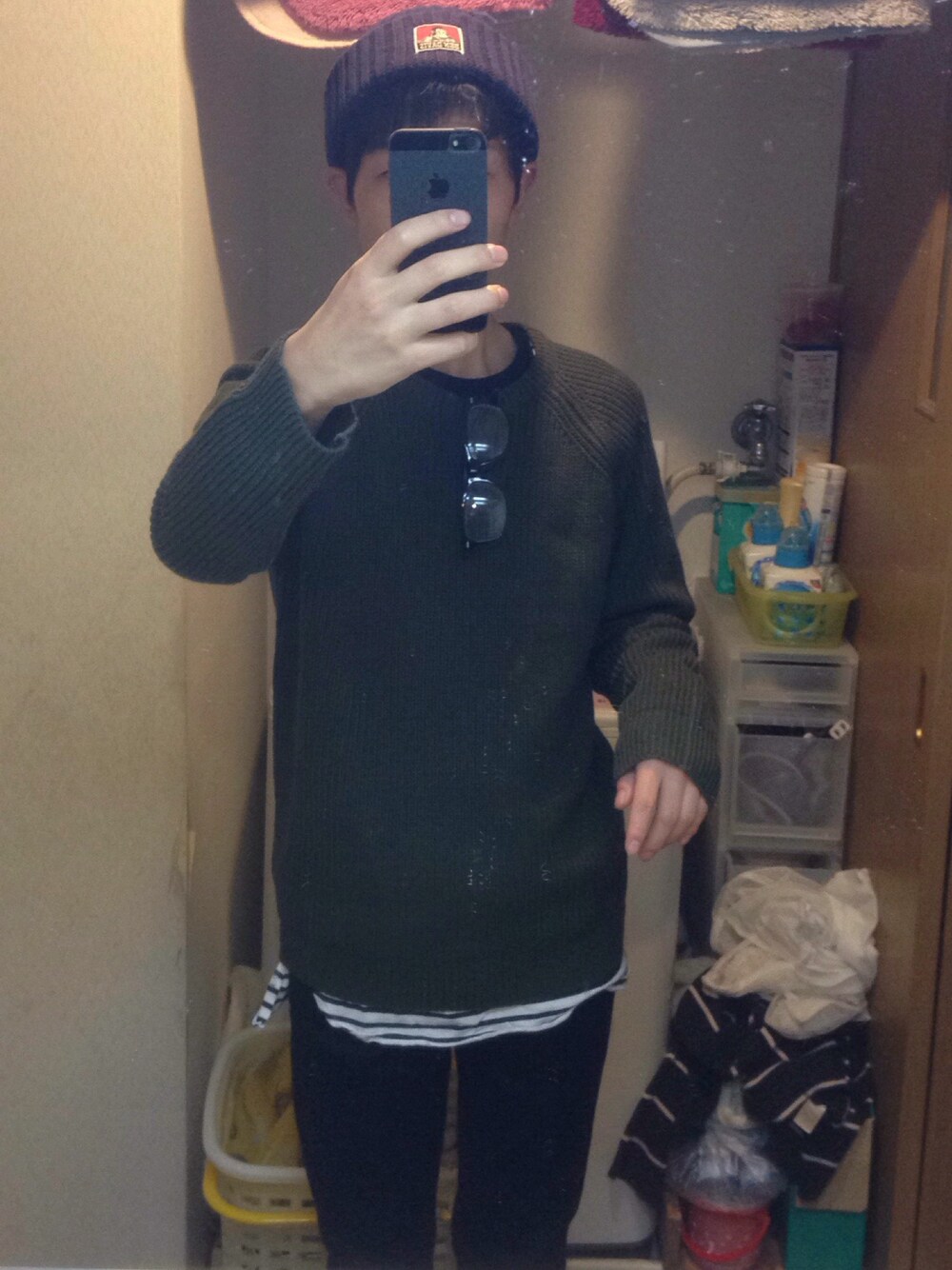 カーキ色のニットに黒のパンツを合わせましたー、チラ見せにボーダーのロングTシャツきました。ニット帽も久しぶりにかぶりました!お気に入りです!よかったらいいねなどお待ちしてます!