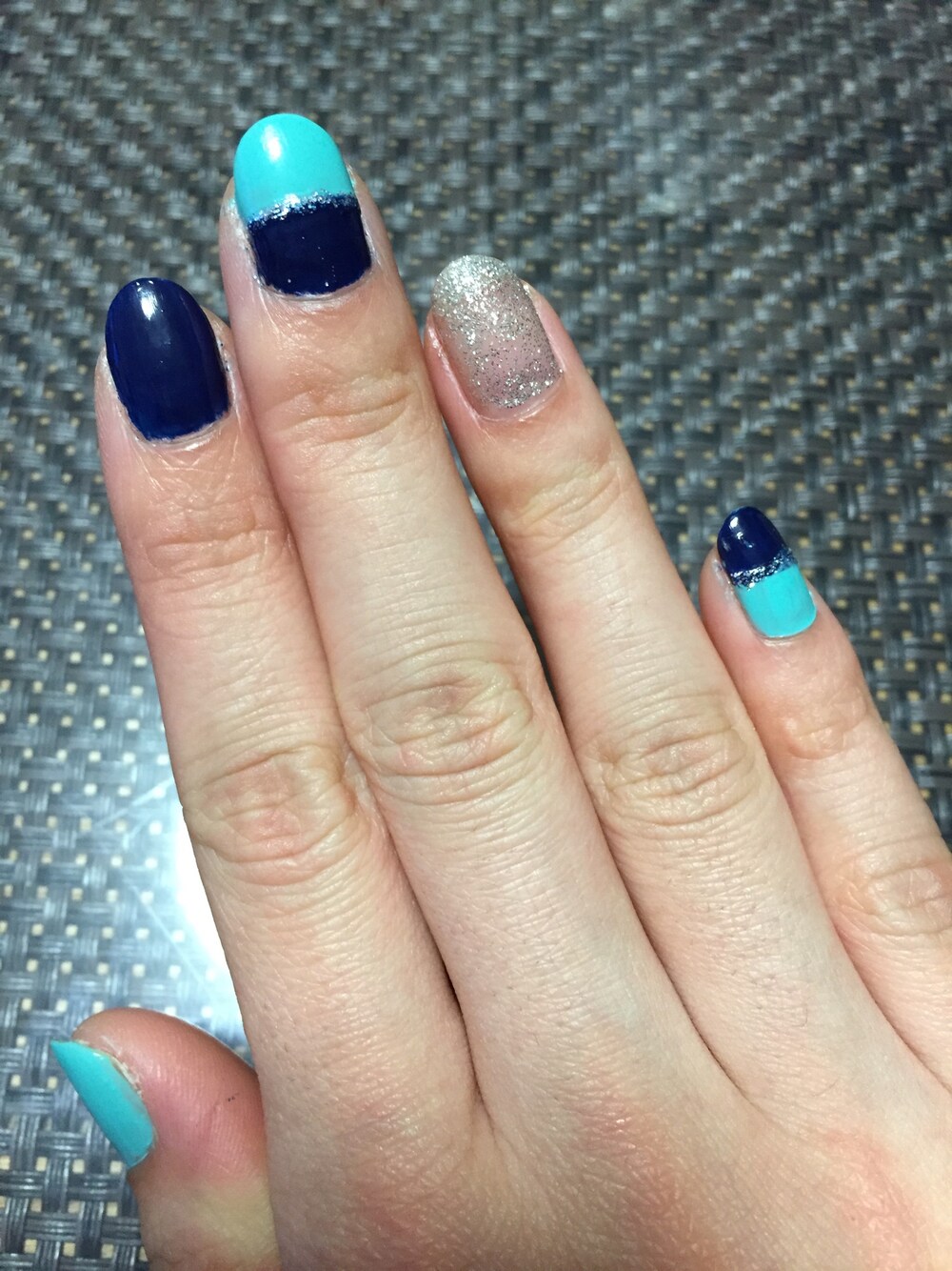 ターコイズブルー&ネイビーのバイカラーネイル💅🏻✨ ワンポイントにシルバーのラメを✨