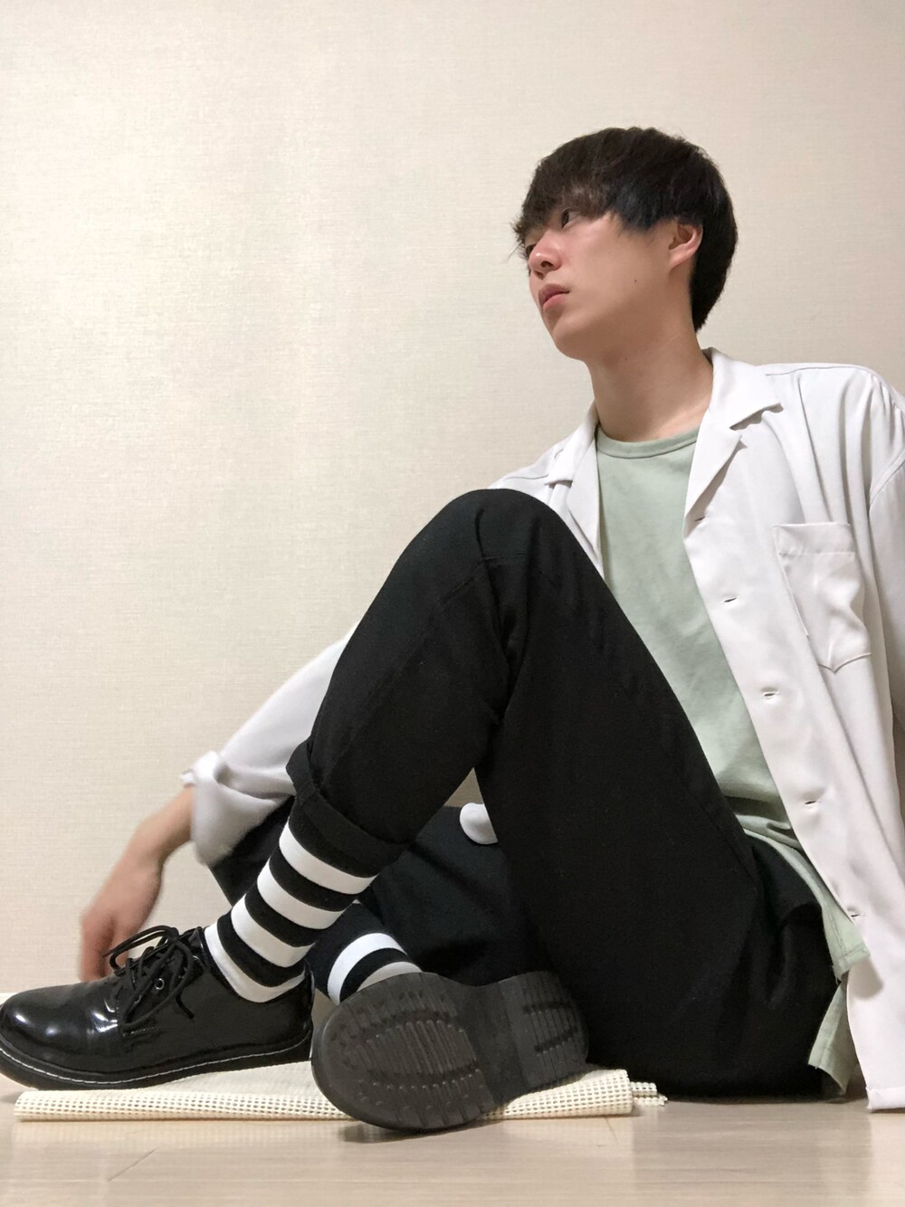 白のオープンカラーシャツ!! きれい目コーデ!!! 差し色グリーン系のトップスをいれました!!