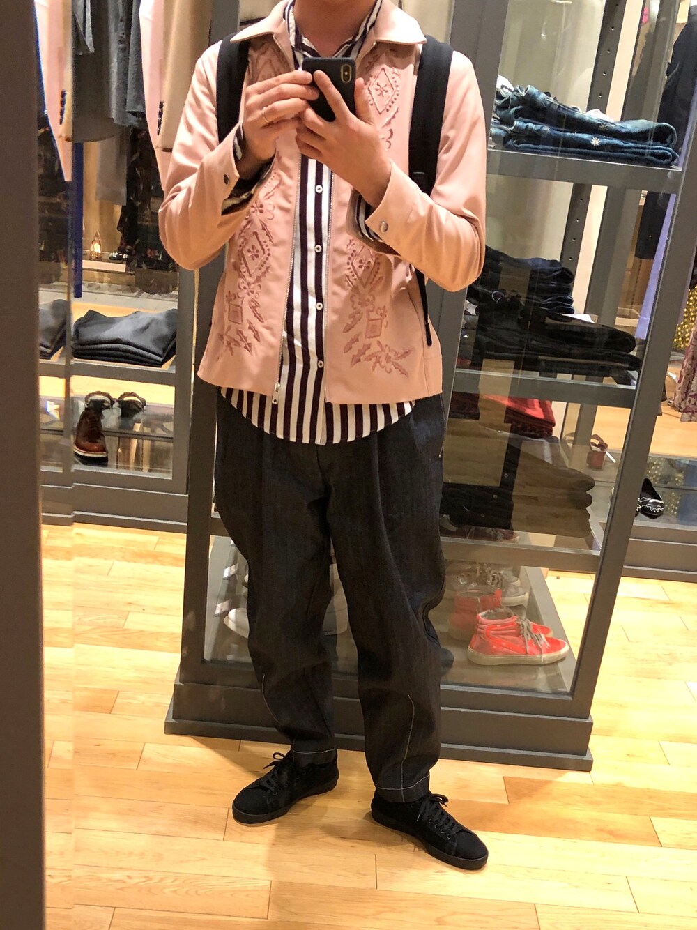 こんばんは🌙 今日は神戸三宮をブラブラしてからの三田アウトレットへGo🚗 お店のデッカい鏡の前でパシャり😮笑 UNITED TOKYOのピンクのブルゾンとバルーンシルエットのデニムパンツが最高過ぎます🙋♀️