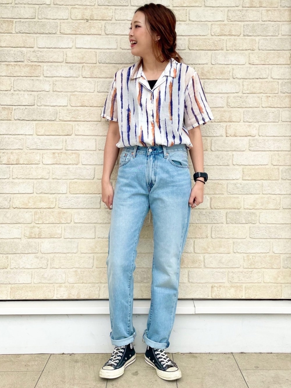 水彩絵の具で手描きしたようなストライプ柄が印象的な半袖開襟シャツ🌞 今回はメンズの淡色デニム (→ 「551Z Authentic Straight Jeans」程よいルーズ感で女性にもオススメです‼️) と合わせて夏らしさ満点🌺🌺🌺 大人カジュアルコーデにしました‼️ 程よいゆとり感のあるシャツなので サッと羽織るだけでオシャレ度UP✨ トレンドのシアー感もポイントです😇