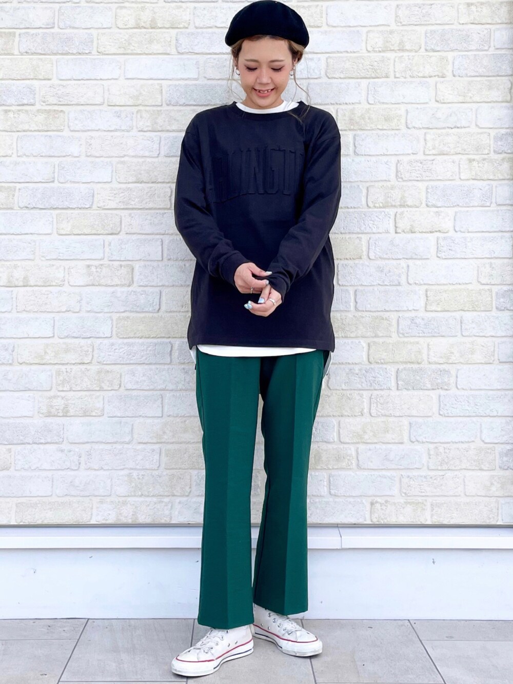 💚人気のカラーパンツコーデ💚 スタッフにも大人気なカラーパンツ👑 サラッとした肌触りで軽く着心地抜群なアイテムです👌🏽 センタープレスにフレアデザインで 嬉しい脚長効果も😇✨ トップスを選ばなので カジュアルにもキレイめにも着こなすことができます💓 今回はトレンドのカレッジロゴを エンボス加工されたロンTと🖤 シンプルながらもアクセントに😊💓