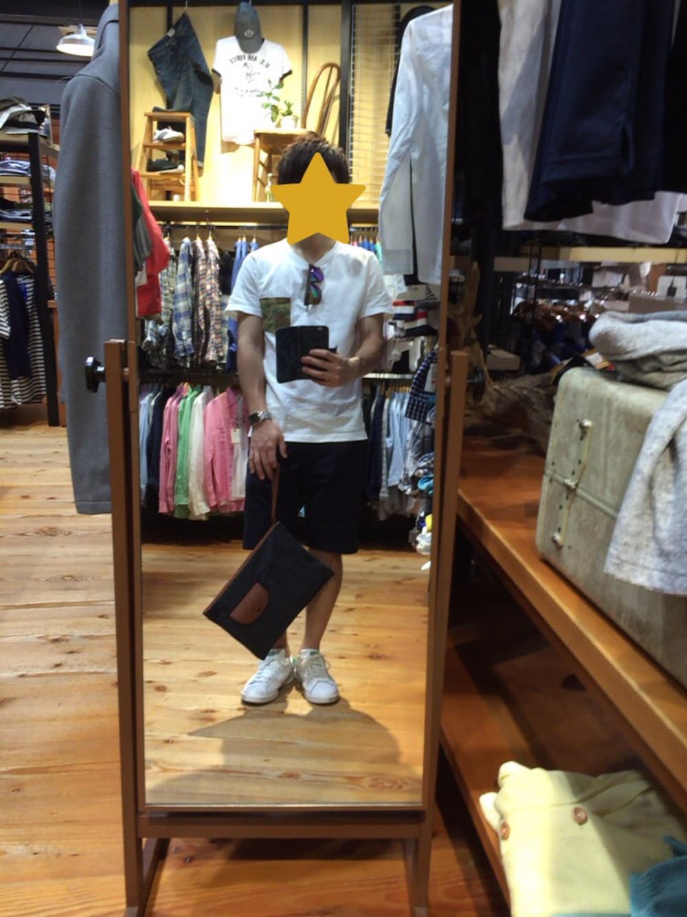 紺のショーツに白のTシャツを合わしたシンプルコーデに! Tシャツは迷彩のポケットがポイントです! またメガネを胸元に取り入れてみました! また足元も白スニーカーを取り入れて爽やかさを出せるようにしました(^^)