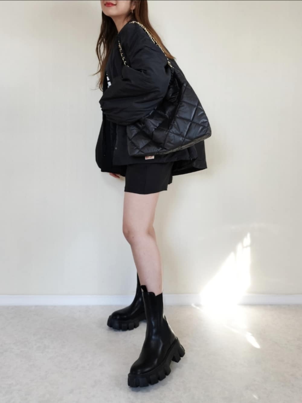michanのノーカラージャケット「《JaVa ジャバコラボ》軽くて暖かい!シャカシャカ素材サイドファスナーノーカラーブルゾン」を使ったコーディネート