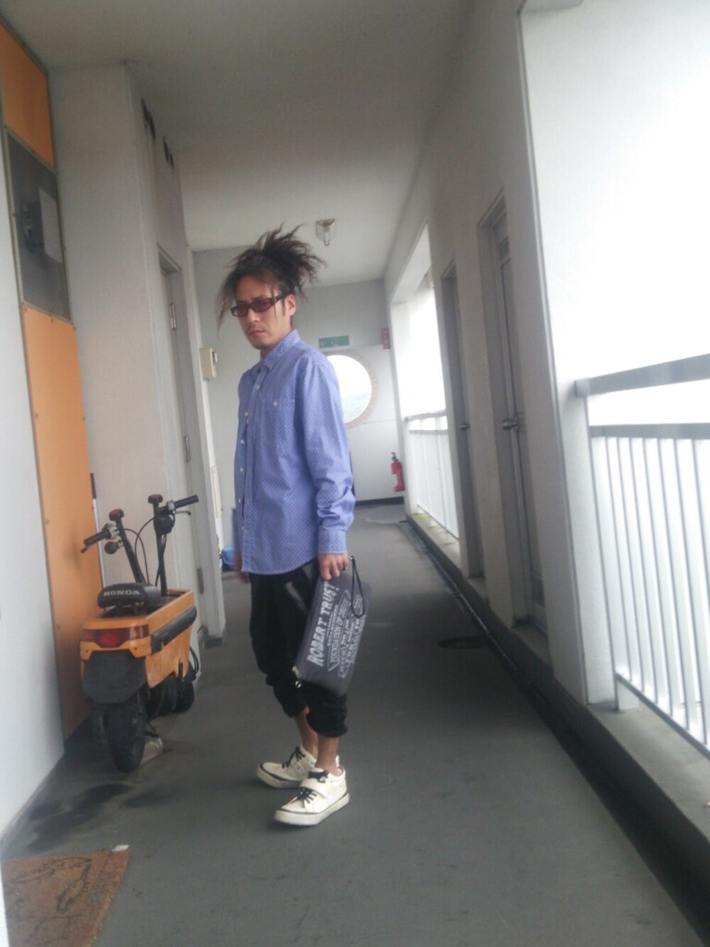 水玉模様のシャツ 黒のハーパン 白のクラシックシューズ クラッチバック サングラス 黒に水色をたして涼しさをUPしています♪