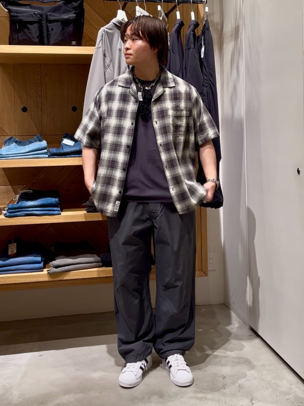 サラッとした肌触りのチェックシャツにナイロンのワイドパラシュートパンツを合わせたストリートMIXスタイル。 インナーもブラックのヘビーウェイトTシャツを合わせてより引き締まったスタイルに仕上げました。 足元は白のsuperstarで抜け感を。