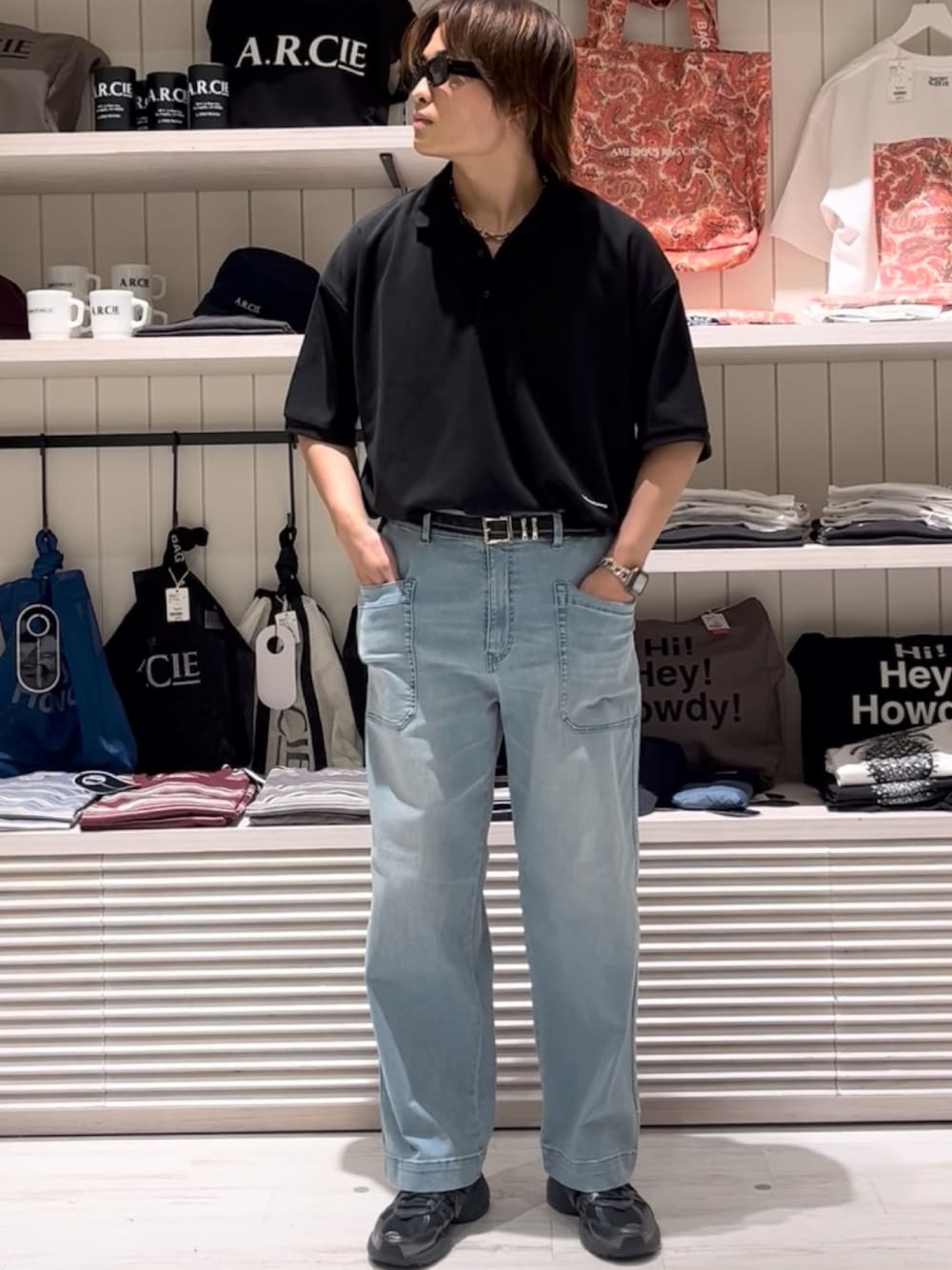 肌馴染みの良いカノコ生地のポロシャツにワイドデニムパンツを合わせたシンプルスタイル。 シンプルになりがちな夏の合わせ方ですが、タックインすることで子慣れ感も生まれオシャレ見えしますよ!