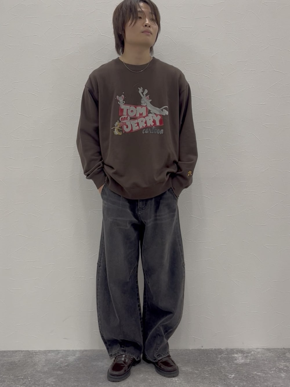 ご覧いただきありがとうございます! トムとジェリーのアソートプリントにカーブラインデニムを合わせたカジュアルスタイル。 アソートプリントのスウェットには男くさいブラックのデニムを合わせるとバランスが取れてかっこよさも増しますよ!