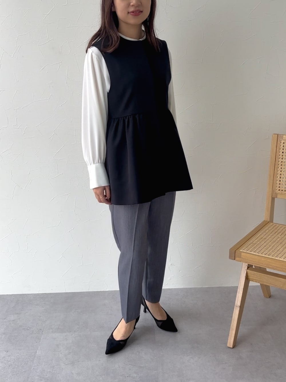 natsumi(nissen本店)のベスト「小さいサイズ ダブルクロスペプラムベスト 低身長さん・小柄女性」を使ったコーディネート