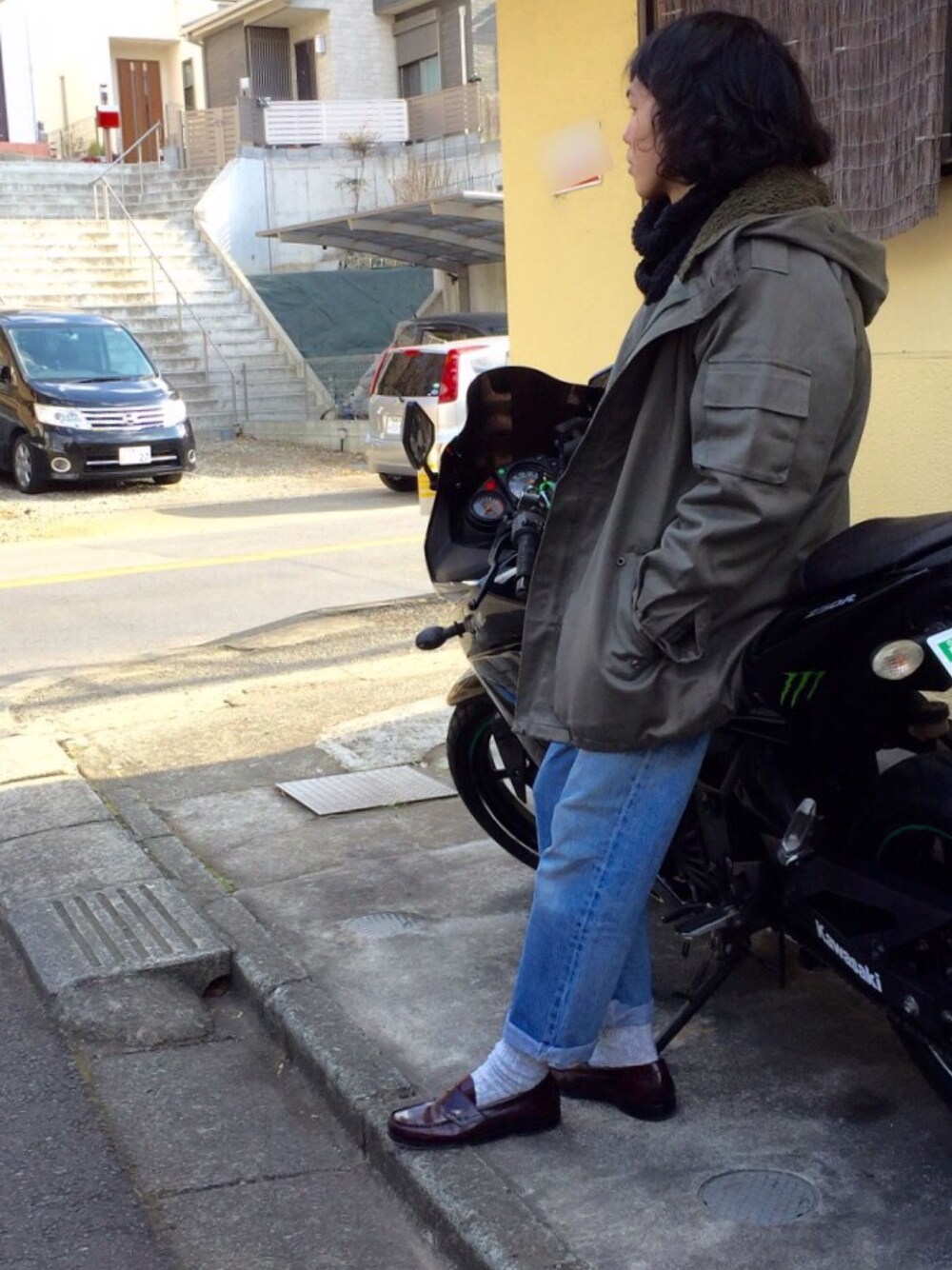 こんばんは! バイクコーデ見て撮りたくなり、バイクも一緒に笑 この格好では、乗りません笑 テールランプも写したかったので小窓にて笑