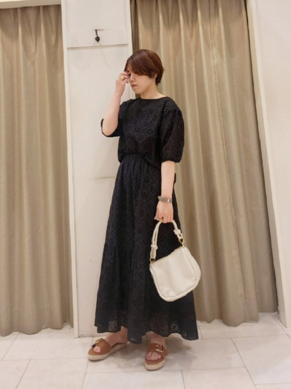 カットワークレースの セットアップを着用しました🌷´- スカートは裾にかけて、ふんわりと 広がるデザインがとても可愛いです🙂↕️ ブラックは甘くなりすぎず、 カジュアルなサンダル合わせにも ぴったりです🌱