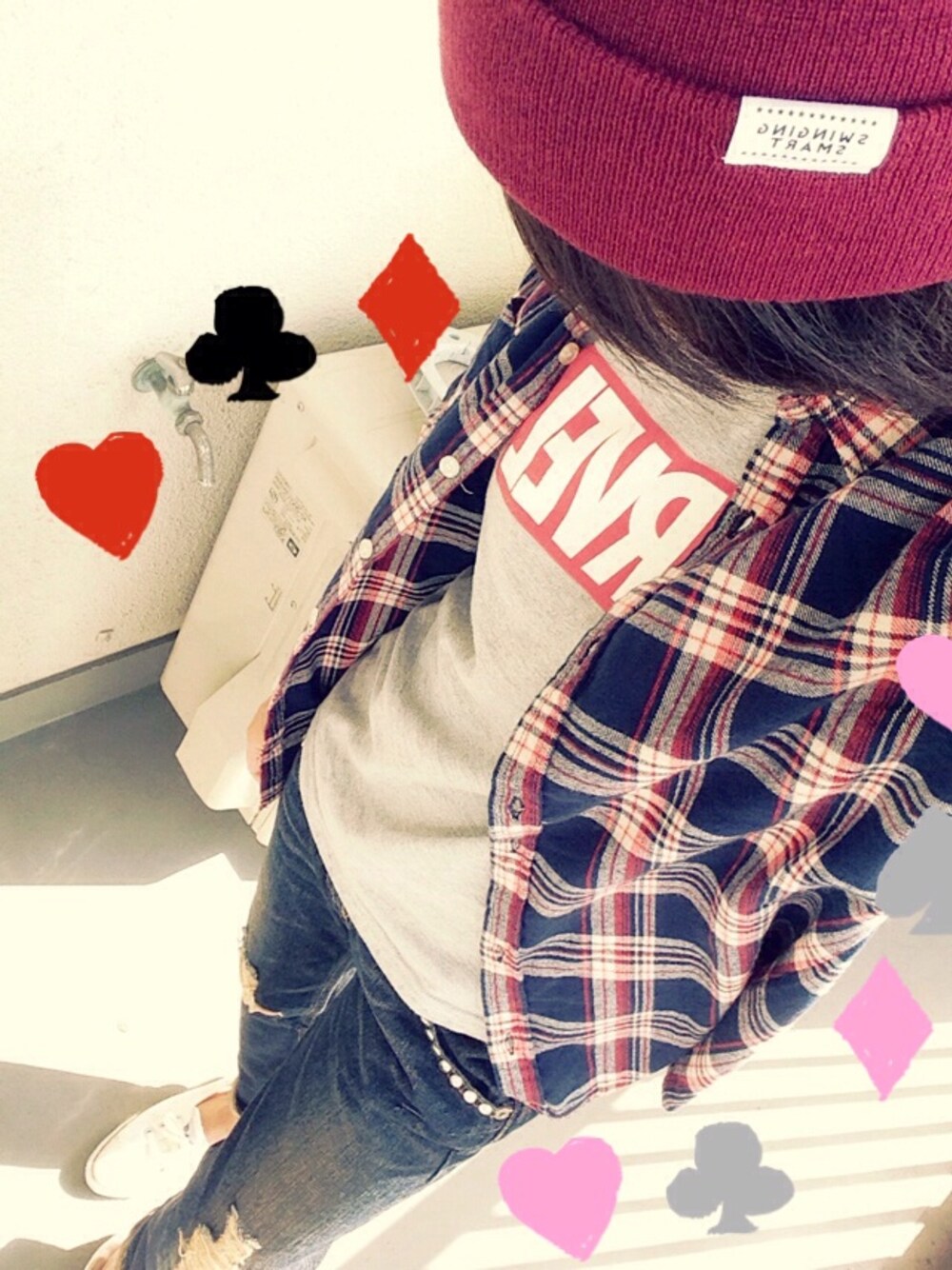 どカジュアル♥︎ 今までニット帽探してたけど、やっと見つけた‼︎ お店で試着しまくったけど、なかなか合うのがなかった(ーー;) あと、このネルシャツも♥︎