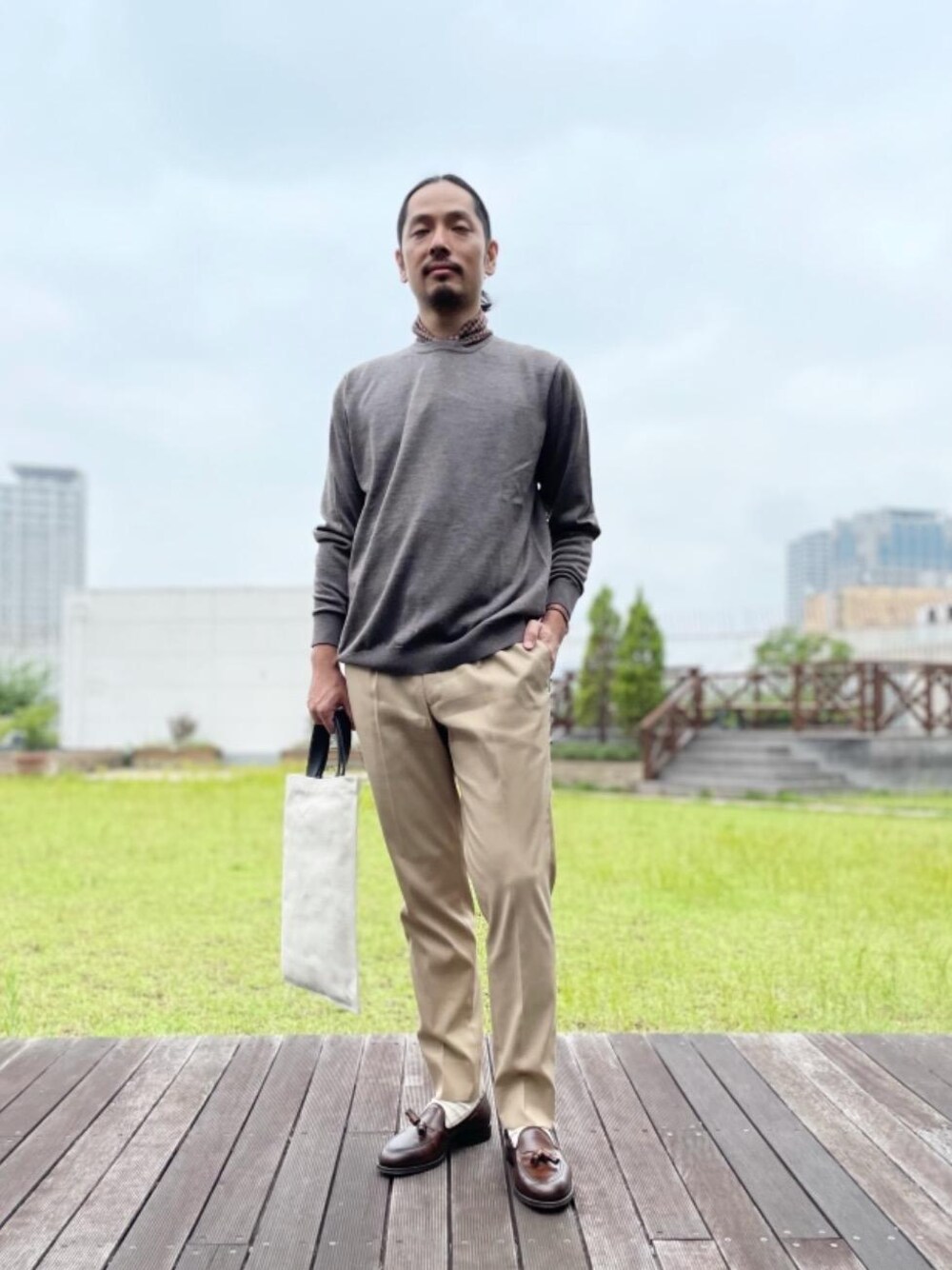 【身長】 176cm 【普段のサイズ】 トップスM/ボトムスM/シューズ24.0cm 【素材感】 ニット:メランジ糸による表情のある素材感。 ボトムス:少し光沢のあるキレイ目な素材感。 【サイズ感】 ニット:普通 ボトムス:少し細身 【着心地】 ニット:ハイゲージらしく、ジャケット等のインナー遣いや1枚着にも着用できる軽やかな着心地です。 ボトムス:柔らかく、サラッと着用頂ける着心地です。 【コーディネートポイント】 秋らしさを取り入れた、ブラウンベースのコーディネートです。 ニットは普段より1サイズアップにして、リラックスした雰囲気が出るようにしてみました。 サイズアップにしてもジャケットは羽織れそうです。