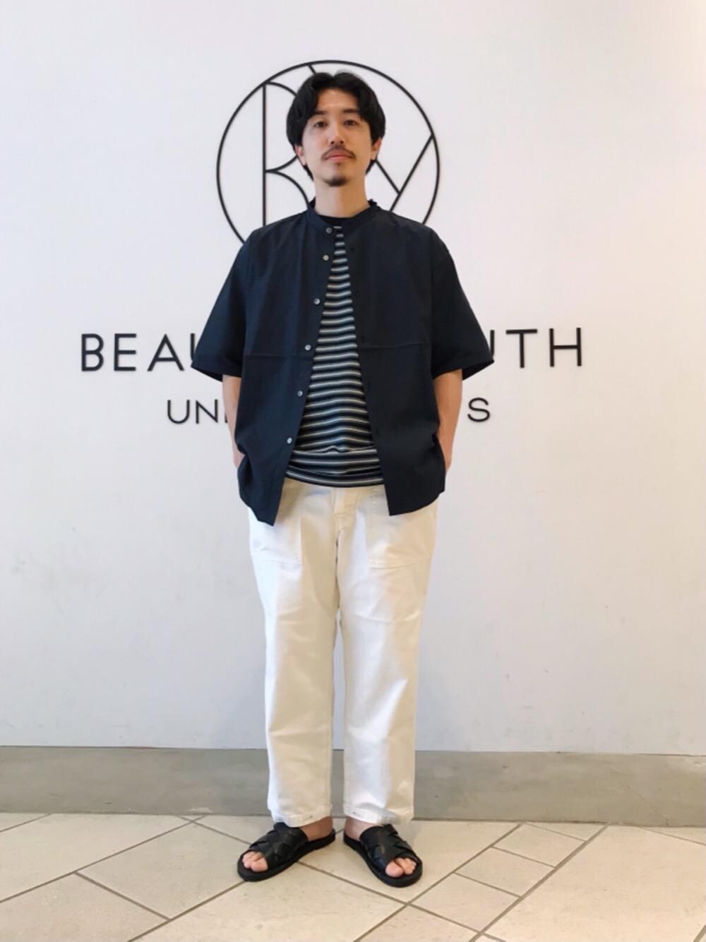 身長:165cm 普段サイズ:トップス M/ボトムス S/シューズ25.5cm 【サイズ感】 トップス:ゆったり ボトムス:ややワイド、短め シューズ:標準的 【素材感】 シャツ:薄い。ドレープ感がある。 Tシャツ:肉厚でどっしりとしている。 【着心地】 シャツ:空気を含んだようなフワッとした軽やかさがある。 サンダル:足馴染みがよく、靴底もしなやかでクッション性あり。レザーサンダル特有の履き心地の面での懸念は無し。 【コーディネートポイント】 レザーサンダルとシャツの組み合わせをボトムとインナーでカジュアルダウンさせました。 シャツを脱いでもまとまるように気をつけました。