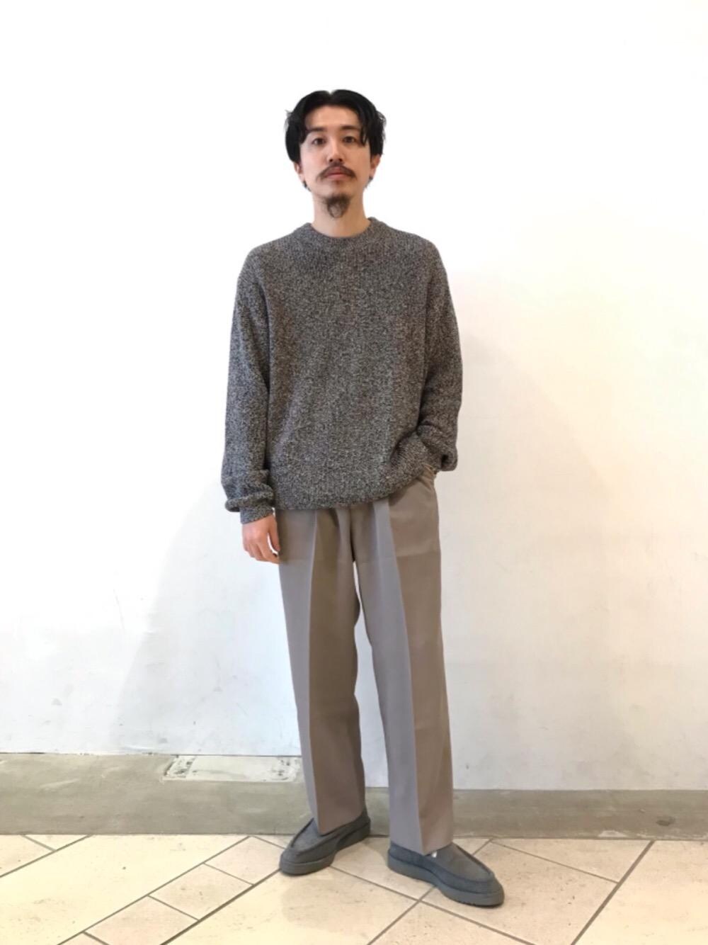 身長:165cm 普段サイズ:トップス M/ボトムス S/シューズ25.5cm 【サイズ感】 トップス:ワイド ボトムス:ワイド シューズ:標準的 【素材感】 トップス:ざっくりと編まれたコットンニット ボトムス:艶、ハリがありプルっとした質感 【コーディネートポイント】 グレイトーンでまとめ、遠目でも分かるような異素材でコーディネートしました。
