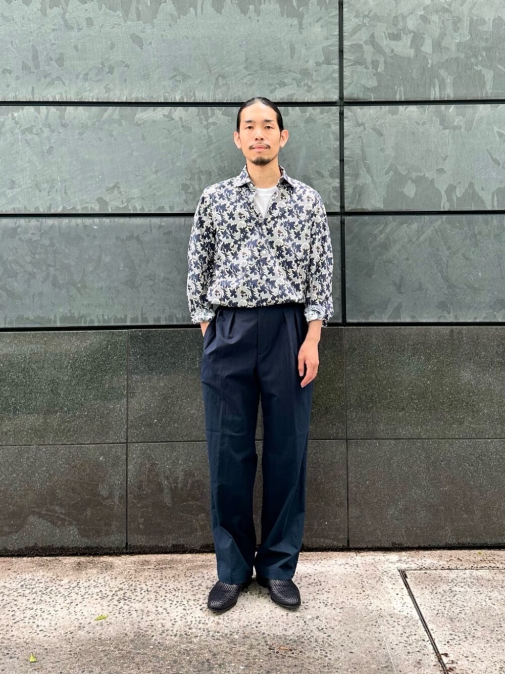 ◇サイズ感 【シャツ】:標準。 【パンツ】:ややゆったり。 【シューズ】:スニーカーサイズ26.5cmで40hサイズがジャストサイズ。 ◇スタイリングポイント 大胆なフラワープリントの総柄シャツを大人っぽく合わせたスタイリング。 タックインし、腕まくりをすることでこなれた印象に。全体的な色のトーンもまとめることで、カジュアルすぎず品のある着こなしを意識しました。