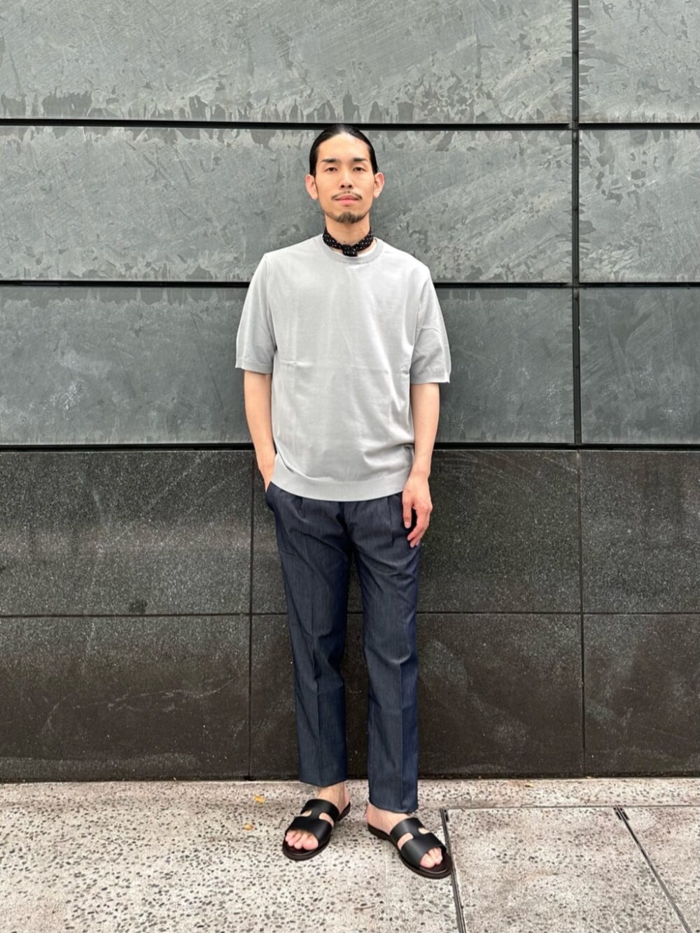 ◇サイズ感 【ニット】:標準。 【Tシャツ】:標準。 【パンツ】:すっきりめ。 【シューズ】:スニーカーサイズ26.5cmで41サイズがジャストサイズ。 ◇スタイリングポイント ニットTシャツをメインにして、スカーフやレザーサンダルで大人っぽく仕上げたスタイリングです。 真夏でも着やすいようにニットTシャツのサイズ感はアップしてますが、袖と裾のリブが効いているため大きくなりすぎずに品よく着ていただけます。