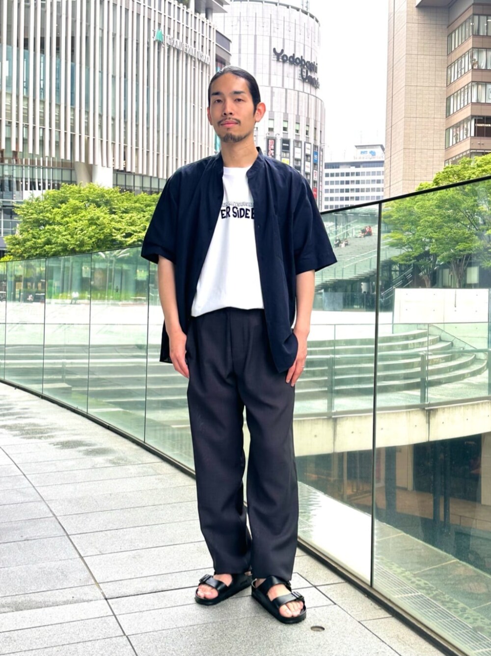 ◇サイズ感 【シャツ】:ややゆったり。 【Tシャツ】:標準。 【パンツ】:ややゆったり。 【シューズ】:スニーカーサイズ26.5cmで41サイズがジャストサイズ。 ◇スタイリングポイント 俳優 光石研さんとのコラボレーションでお作りしたTシャツをシャツ合わせで大人っぽくまとめたスタイリング。 バックプリントもあるのでトレンドであるシアー感のあるアイテムを組み合わせたスタイリングもおすすめです。