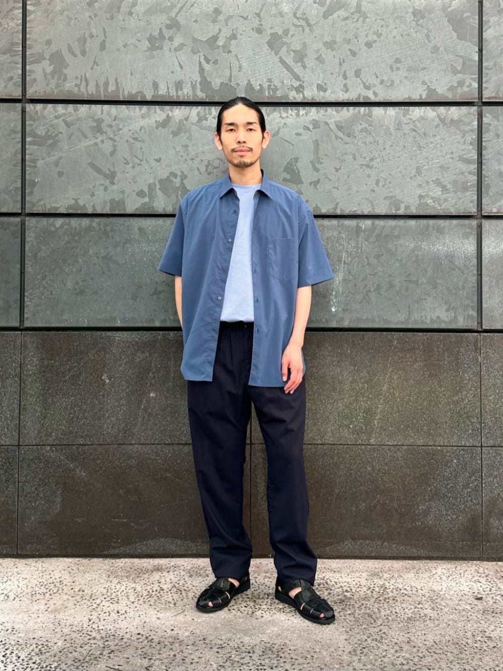 ◇サイズ感 【シャツ】:ややゆったり。 【パンツ】:ややゆったり。 【カットソー】:ややゆったり。 【サンダル】:スニーカーサイズ26.5cmで41サイズがジャストサイズ。 ◇スタイリングポイント 夏らしいブルートーンでまとめたスタイリング。 半袖でカジュアルな装いが増えてくる季節ですが、Tシャツをタックインすることで大人っぽく上品に着こなしていただけます。