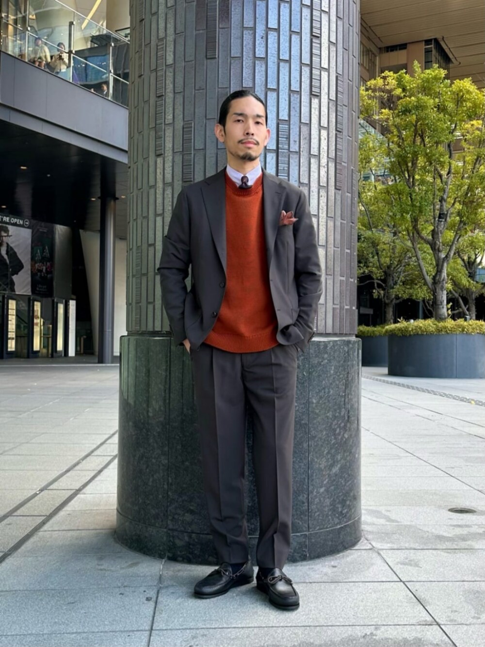 ◇サイズ感 【ジャケット】:ややゆったりめ。 【ニット】:ややゆったりめ。 【シャツ】:標準。 【パンツ】: ややゆったりめ。ワイドテーパードシルエット。 【シューズ】: スニーカーサイズ26.5cmで8着用。 ◇スタイリングポイント 鮮やかなニットをメインにしたスタイリング。 ブラウンのセットアップやライラックカラーのシャツやネクタイなどメインのニットを引き立たせるようなカラーリングを選びました。