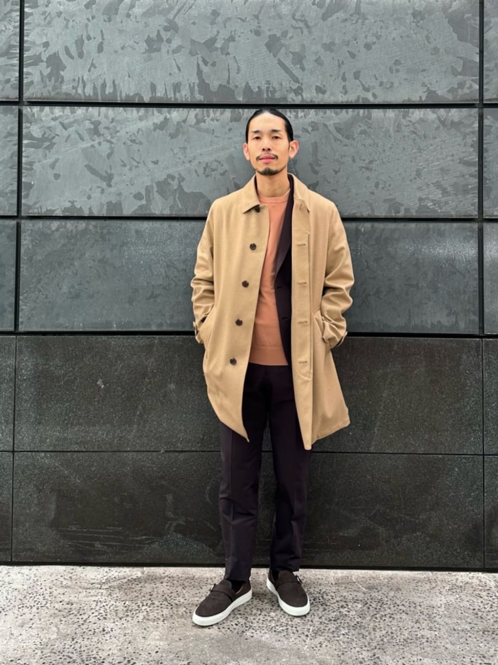田中千加良(ユナイテッドアローズ 大阪メンズストア)のステンカラーコート「テック フランネル バルカラーコート」を使ったコーディネート