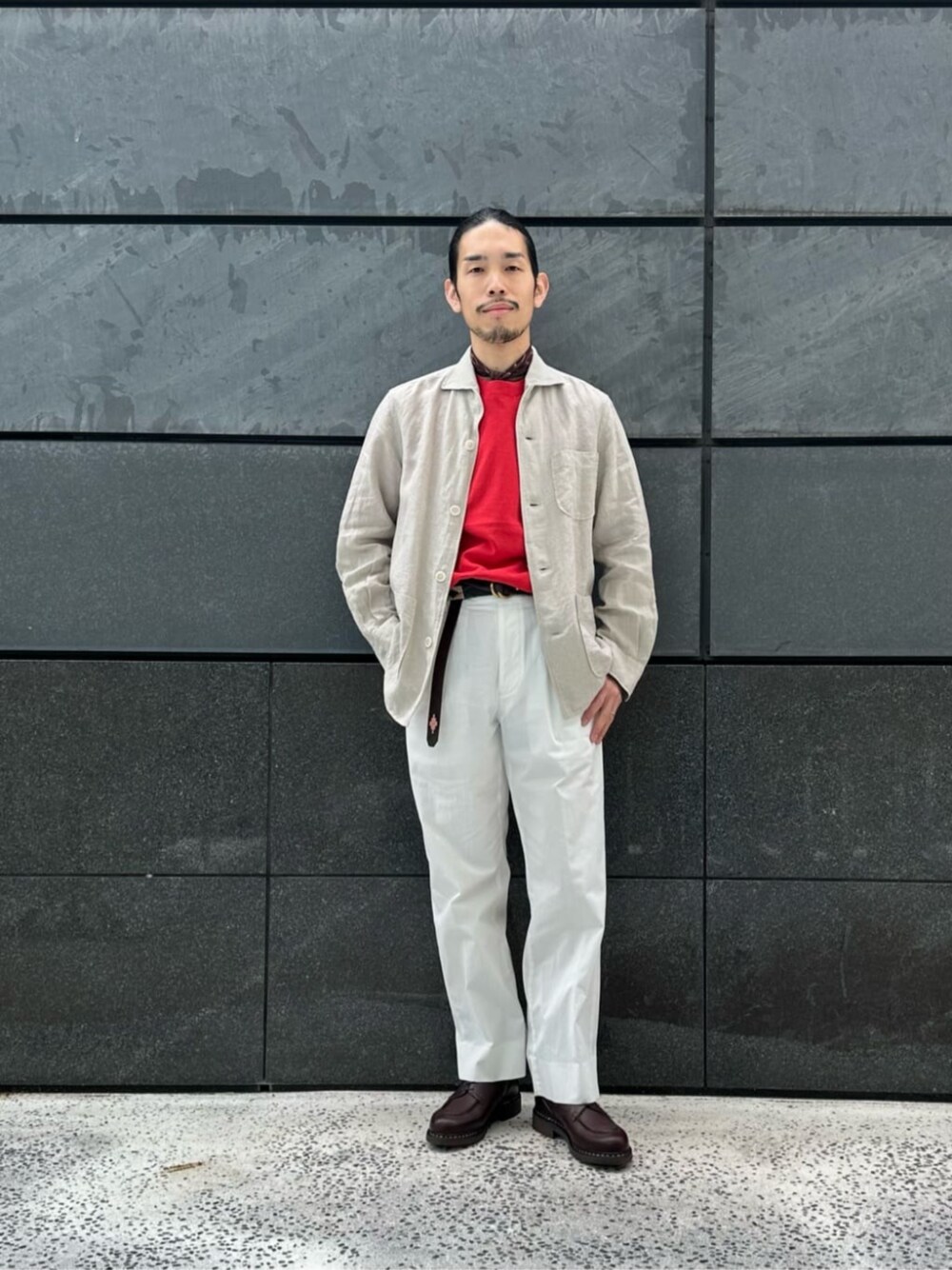 ◇サイズ感 【シャツ】:標準。 【ニット】:ややゆったりめ。 【パンツ】:ややゆったりめ。 【シューズ】:スニーカーサイズ26.5cmで7がジャストサイズ。 ◇スタイリングポイント オレンジのニットを差し色に、エスニックなアイテムでまとめたスタイリング。 シューズはParabootでボリューム感を調整しました。