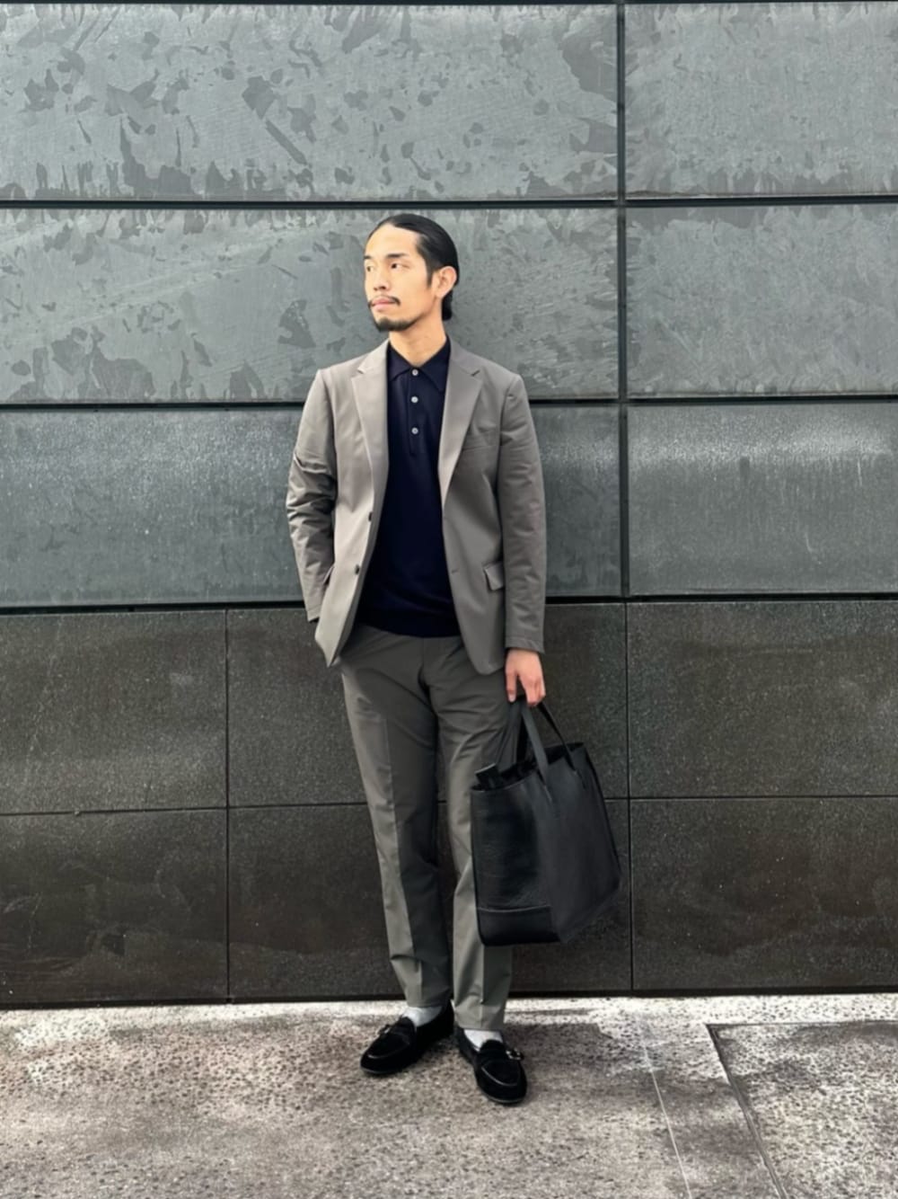 ◇サイズ 【ジャケット】:標準的。 【ニット】:標準的。 【パンツ】:標準的。テーパードシルエット。 【シューズ】:普段スニーカーサイズ26.5cmで41がジャストサイズ。 ◇スタイリングポイント オリーブカラーの男性らしいセットアップにネイビーのニットポロシャツを合わせて、若さを演出したスタイリングです。