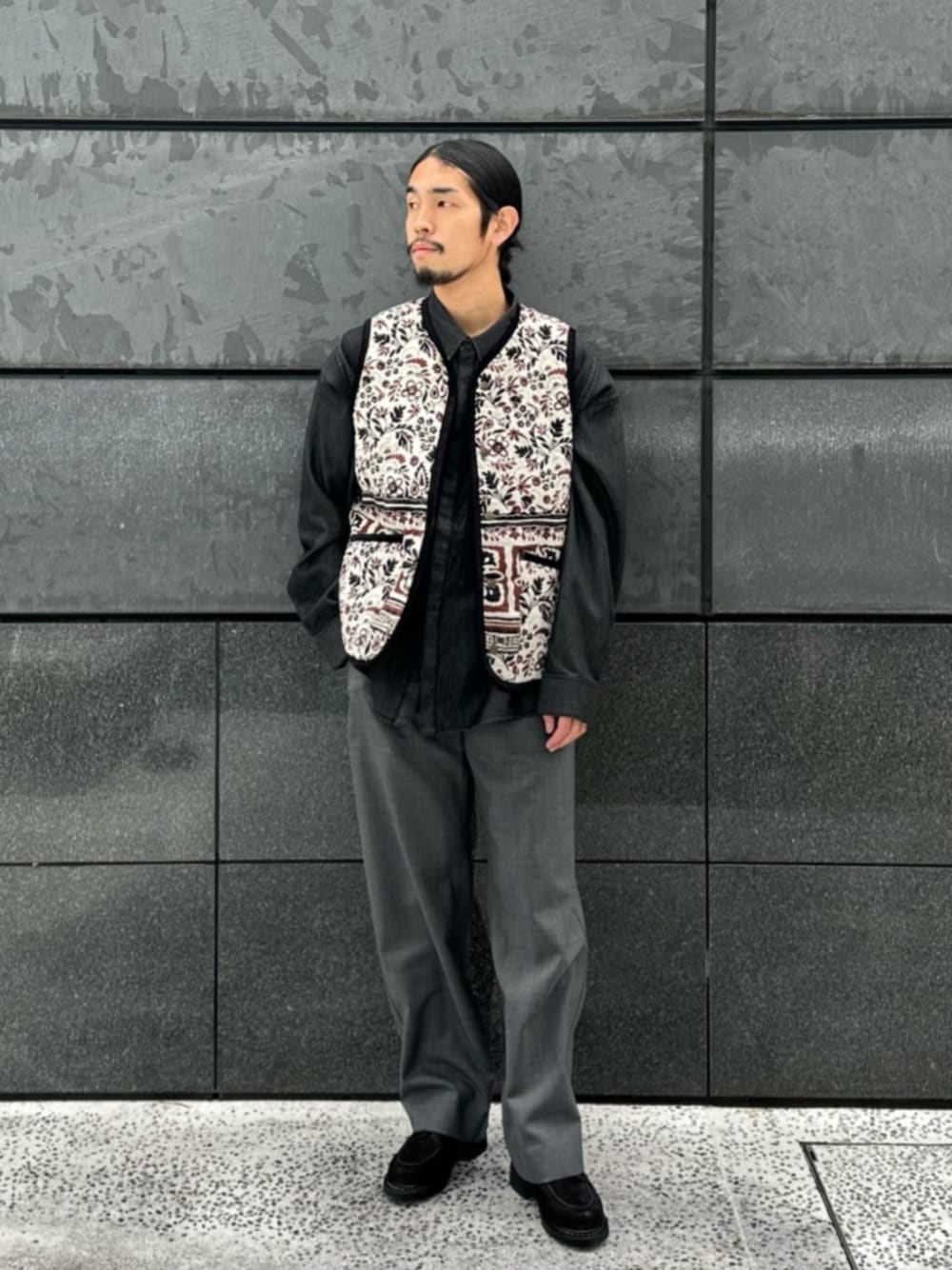 ◇サイズ感 【ベスト】:標準的。 【シャツ】:ゆったりめ。 【パンツ】: ややゆったりめ。ストレートシルエット。 【シューズ】:標準的。スニーカーサイズ26.5cmで6hサイズがジャストサイズ。 ◇スタイリングポイント エスニックなフラワープリントを活かすために他のアイテムはモノトーンでまとめました。 シャツはベストの雰囲気に合うようにPHEETAを選んで点もポイントです。