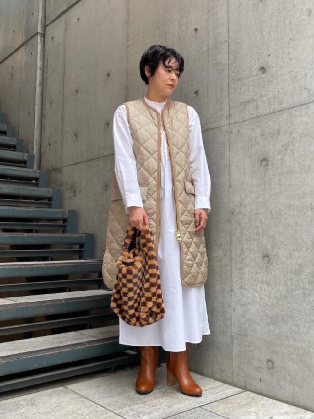 身長:159cm 普段サイズ:トップス36/ボトムス36.38/シューズ23.5cm 【サイズ感】 ワンピース:ゆったりめ ブーツ: 標準 【素材感】 ワンピース:コットン100% ブーツ:アッパー 牛革 、ソール 合成底 【着心地】 ワンピース:サイドにスリットの入ったワンピースは動き易いです。白なので少し透け感があります。 ブーツ:ソールに合成底を使用しているため、見た目より軽く7cmヒールでも歩きやすいです。 【コーディネート】 〈Barbour〉別注のキルティングジレを合わせたスタイリングです。ジップ仕様なのですっきりと合わせられます。ベージュ・ブラウンのトーンで温かみのある秋らしいカラーで。