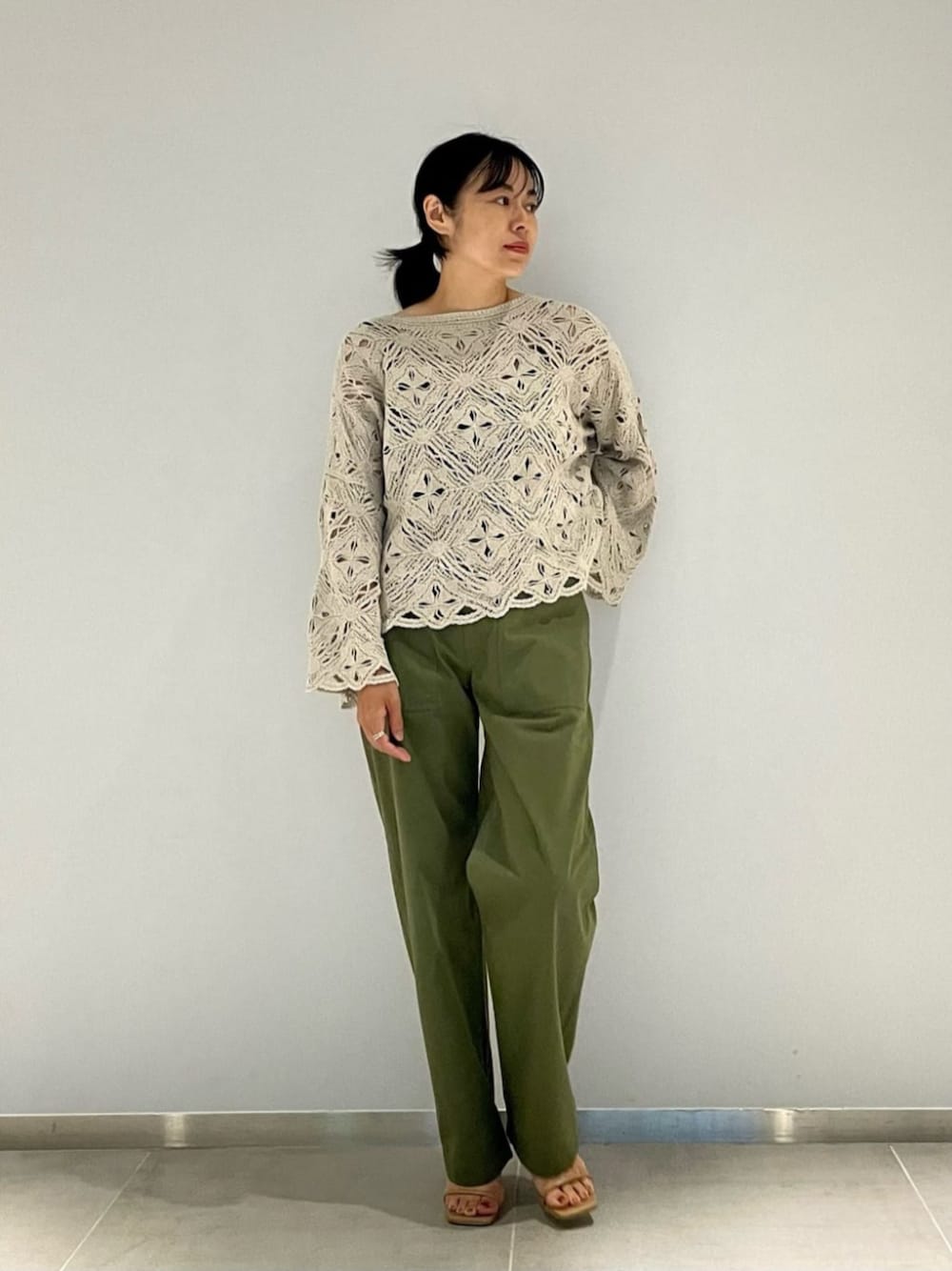 【サイズ感】 ニット:ゆったりめ パンツ:ゆっりめ 【コーディネート】 透け感も程よいニットはベイカーパンツでカジュアルに合わせました。