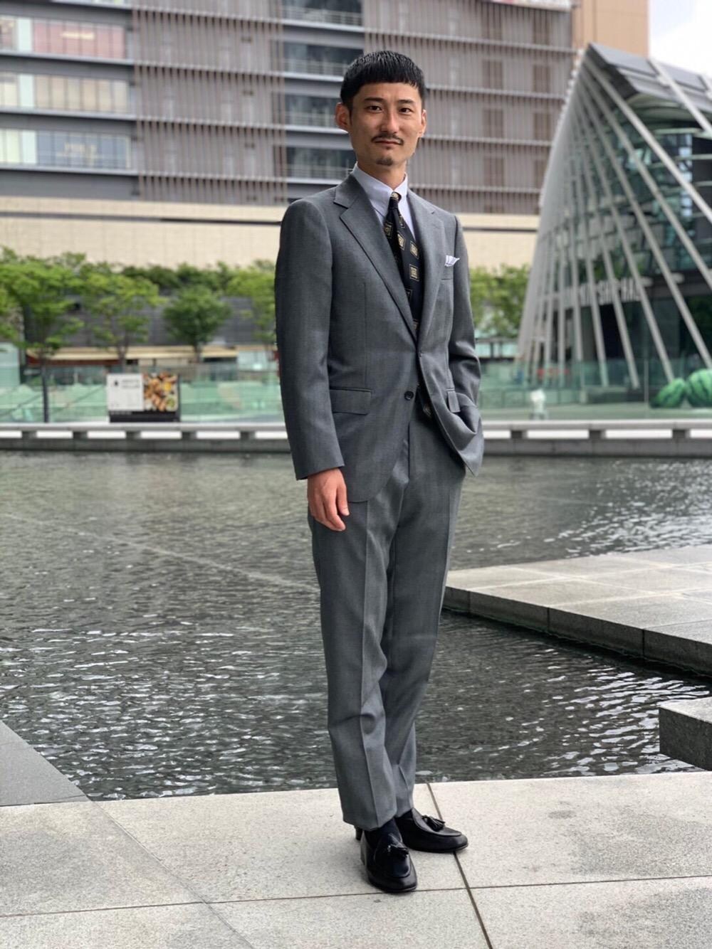 【年齢】30代前半 【身長】173cm 【普段のサイズ】ジャケット:44/トップス:S/ボトムス:44/シャツ:37/スニーカー:26cm/革靴:6.5 【サイズ感・素材感・着心地】 スーツ:標準。落ち着いた印象ヘリンボーン柄。しっかりとした生地感で、秋冬通して着用可。 シャツ:標準。優しい肌触り。通年着用可。 【コーディネートのポイント】 落ち着いた印象のスーツに大柄の幾何柄ネクタイを合わせました。モノトーンの色合わせが都会的な印象を醸し出してくれます。ベルジアンシューズを足元に、重たくなりすぎないドレススタイルを意識しました。