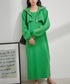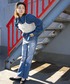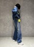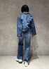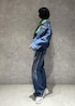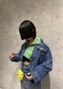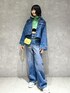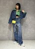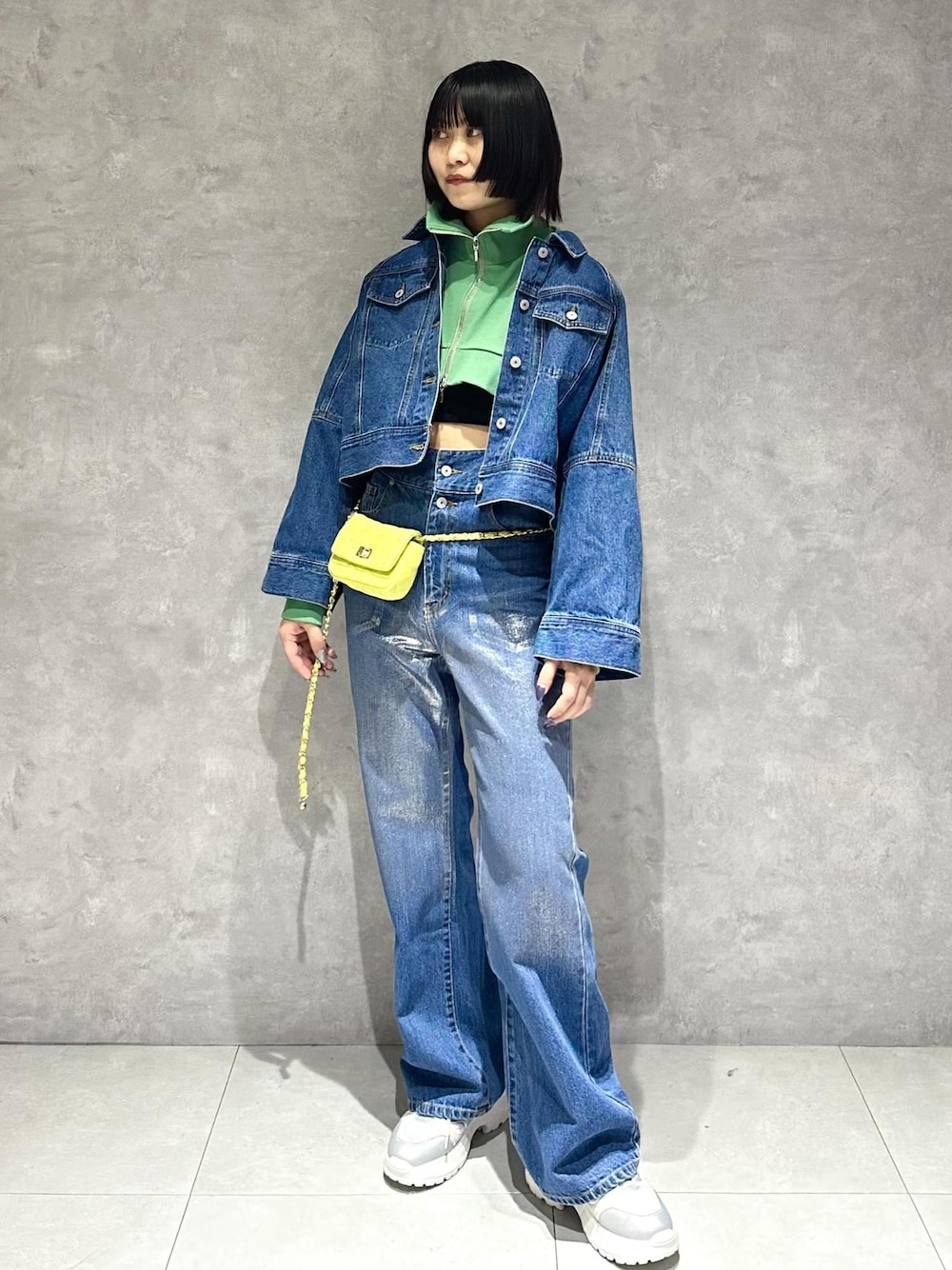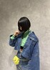 デニムのセットアップにグリーンを差し色! ショート丈で面積少ないので強すぎない印象に♡ 箔プリントで華やかさ◎