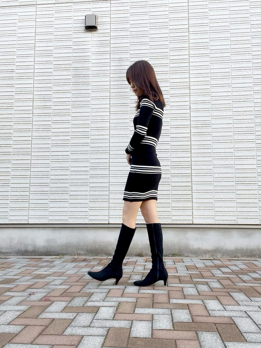 冬のニットワンピースコーデ バランスよくショート丈×ブーツ スタイルアップ効果