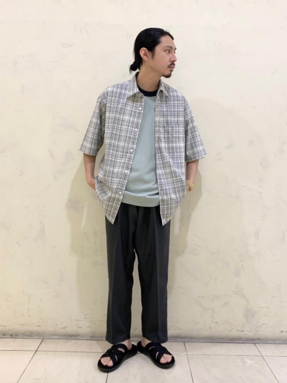 身長:173cm 普段サイズ:アウターMサイズ/ボトムスMサイズ/シューズ26.5cm 【素材感】 天然素材にポリエステルを混紡した素材のショートスリーブシャツ。 【着心地】 暑く、じめっとした季節にもぴったりの手触りと質感です。 【スタイリングポイント】 全体のシルエットはIラインを意識して、スポーティな印象のリンガーTをインナーに。 古着ルックなスタイリングはいかがでしょうか。