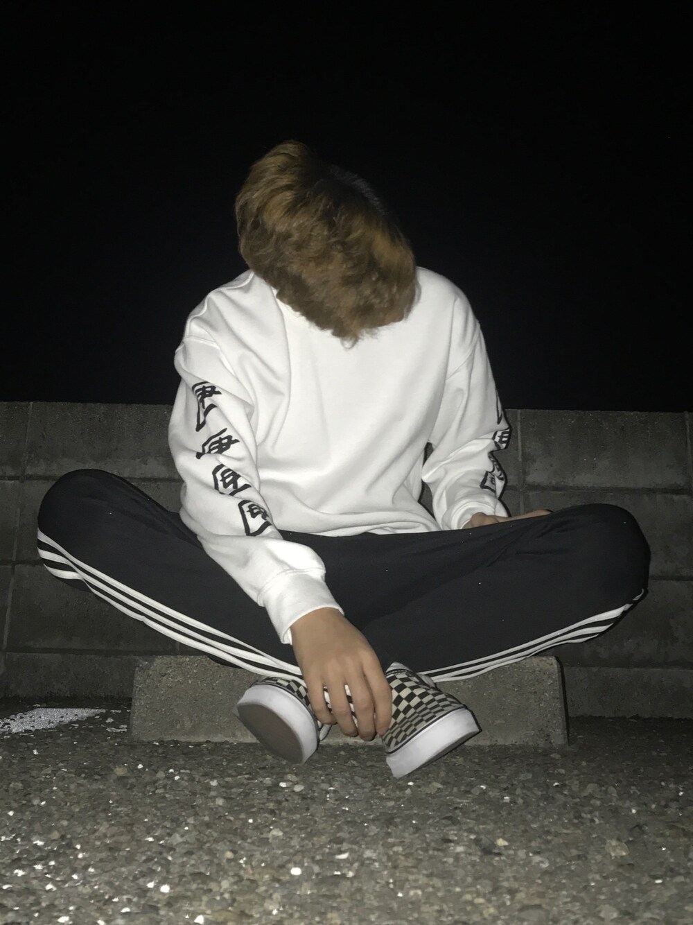 ホワイト系のスウェット、ブラック系のパンツ、ホワイト系のスリッポンを着用したメンズの秋コーディネートの1枚目の写真