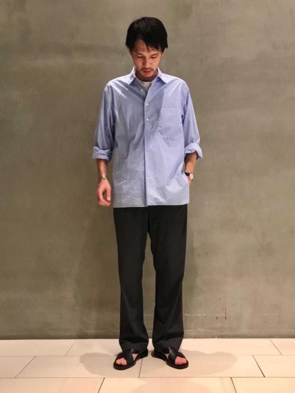 ●身長:183cm ●普段サイズ:トップスL/ボトムスL/シューズ28cm 【サイズ感】 トップス:ややゆったり ボトムス:ゆったり シューズ:標準的 【素材感・着心地】 トップス:手洗い可。コットン100%の柔らかいブロード生地。 ボトムス:手洗い可。非常に軽く風通しの良いレーヨン、ポリエステル、ポリウレタンの混合生地。 シューズ:スタッズが特徴的なレザーサンダル。 【コーディネートポイント】 プルオーバータイプのシャツにイージーパンツを合わせた軽快なコーディネート。パンツは程よくゆとりを持たせたルーズフィットでリラックスした雰囲気で着用していただけます。シャツはタックインでの着用もおすすめです。