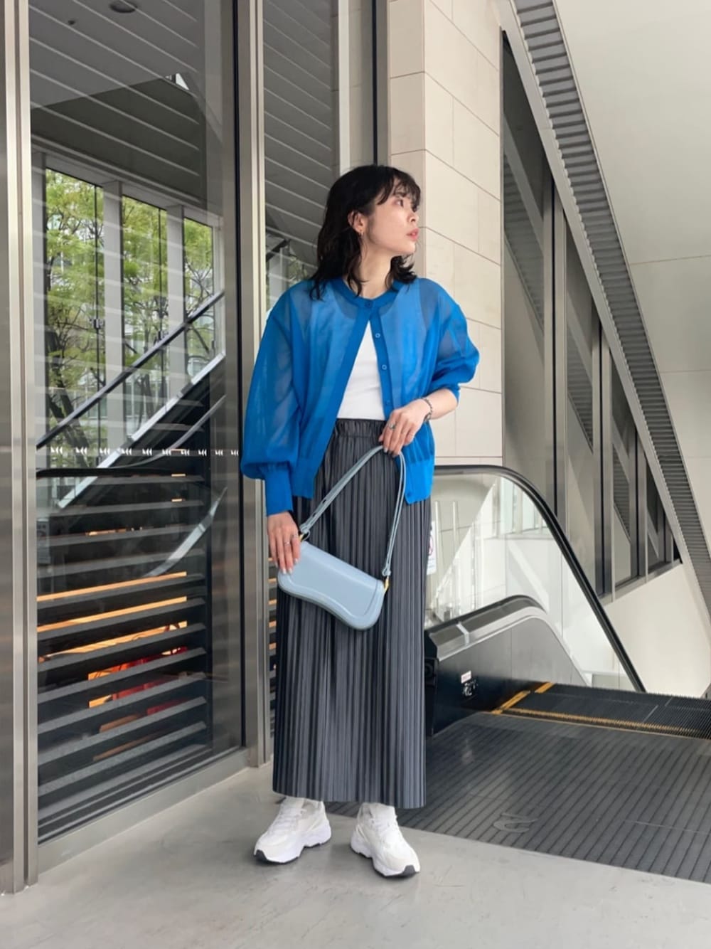 【サイズ感】 カーディガン:ゆったり タンクトップ:標準的 スカート:標準的 シューズ:小さめ 【コーディネートポイント】 艶感の綺麗なスカートをカジュアルにコーディネートしました。