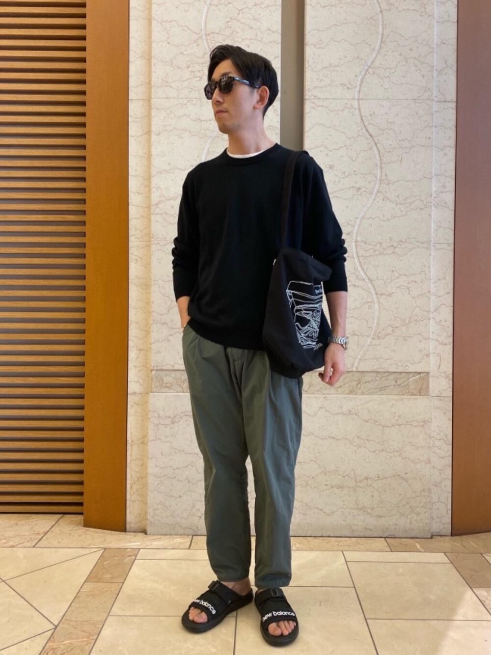 シャツの羽織りだけでは少し肌寒い時期は、コットンニットがおすすめです。全体的にシンプルなスタイリングですが、ボトムスをゆとりのあるナイロンパンツにし、スポーツサンダルを合わせることで、アクティブ感のあるカジュアルなスタイリングになります。