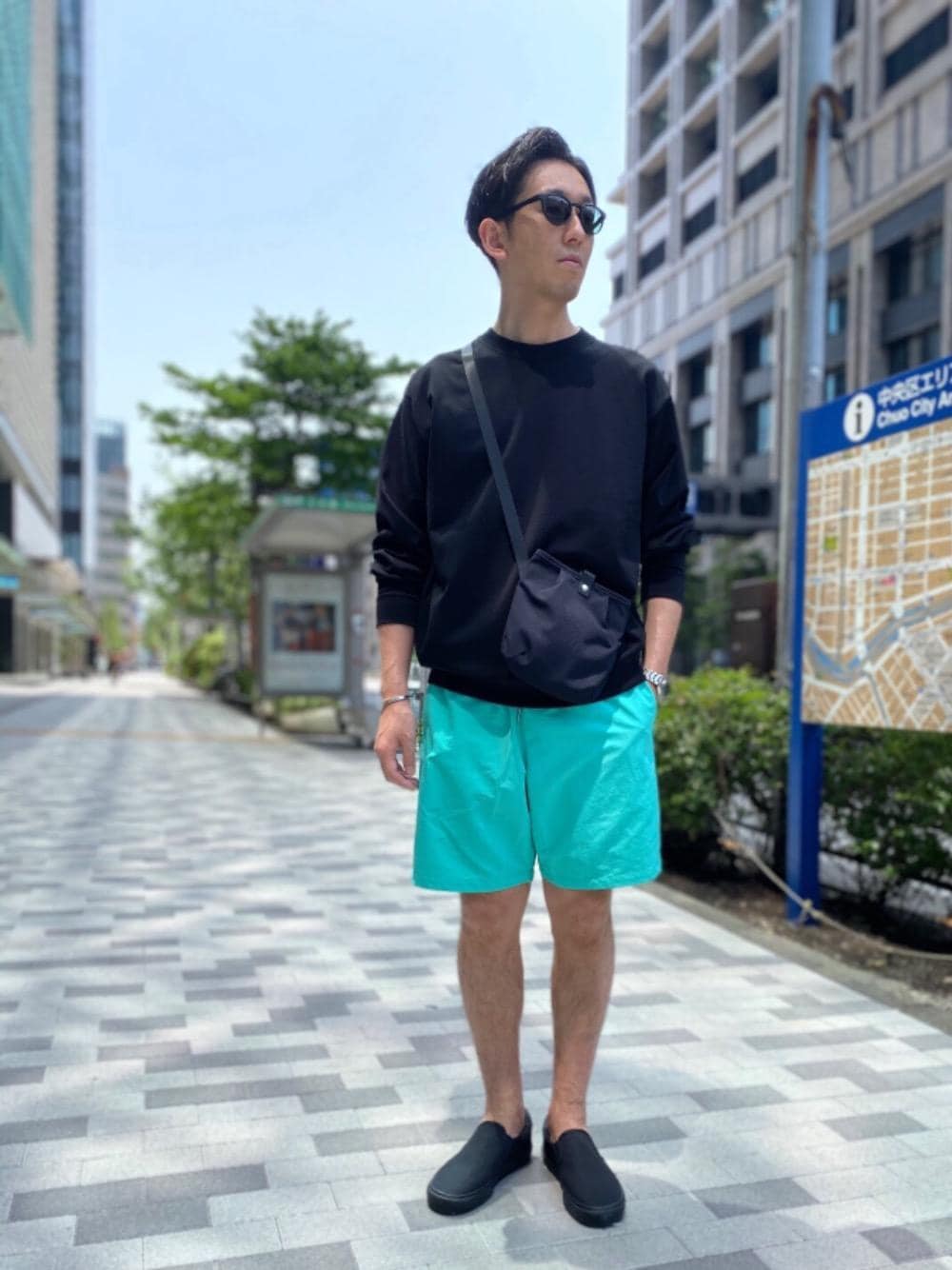 身長173cm 普段サイズ:ジャケット 46( M)/シャツM/ボトムス/44(S)or46(M)/シューズ 26.5cm [トップス] サイズ感:ややゆったり 素材・着心地:少し地厚なコットンロングスリーブTシャツです。首回りのつまりも程よくて苦しくはありません。ゆとりがあるので普段きているサイズよりワンサイズ小さくてもよろしいかと思います。 [ショーツ] サイズ感:標準的 素材・着心地:ナイロンポリ素材のため少しスポーツウエア感があります。着丈は少し長めか標準的な長さになります。 [シューズ] スタンダードなスリップオンスニーカーです。スリップオンなので普段履いているスニーカーサイズよりワンサイズダウンがいいと思います。 [スタイリングポイント] トップスとシューズがブラックで統一されており、全体的に重たいイメージになりがちなのであえてショーツを発色の良いものを選び、全体的に清涼感が出るように致しました。