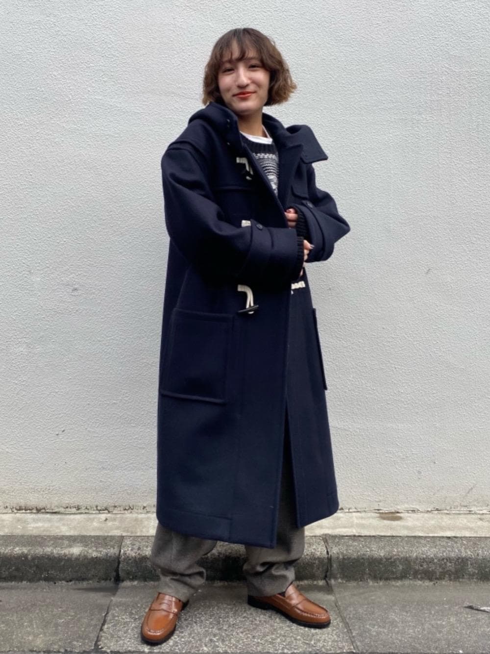 身長:150㎝ 普段サイズ:トップスS/ボトムスS/シューズ23 【コーディネート】 トラディショナルな雰囲気のダッフルコートですが、オーバーなサイズ感とゆるめのパンツでトレンド要素もプラスしました。足元をローファーにするときちんと感が出ます。 【素材感、着心地】 アウター:Sサイズでもゆったり目のお作りです。オーバーなサイズ感が可愛いです。 トップス:こちらもゆったり目でチクチクせず楽に着用出来ます。 ボトムス:バックゴムで楽に着用出来てゆったり目のお作りです。