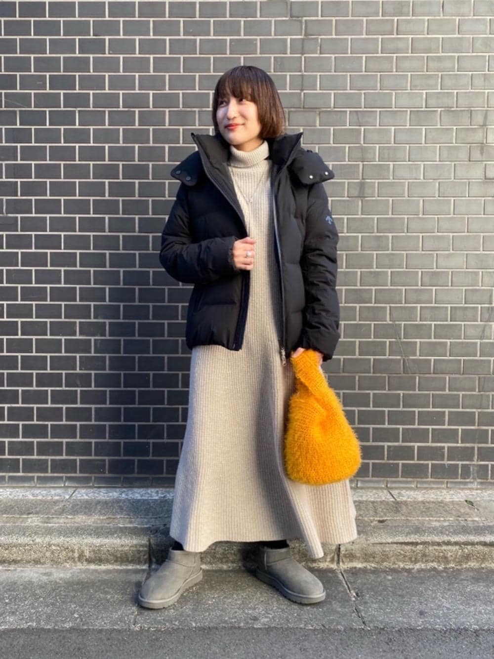 身長:150㎝ 普段サイズ:トップスS/ボトムスS/シューズ23 【コーディネートポイント】 ロングセラーの水沢ダウンを主役に、目を惹くオレンジのバッグをポイントにしました。 【素材感、着心地】 ダウン:メンズサイズをリサイズしているのでSサイズでも窮屈になりません。程よいフィット感がありダウンのみで充分暖かいです。 ワンピース:ゆったり目です。 シューズ:ボアが密着感があるのでジャストサイズで問題ないです。