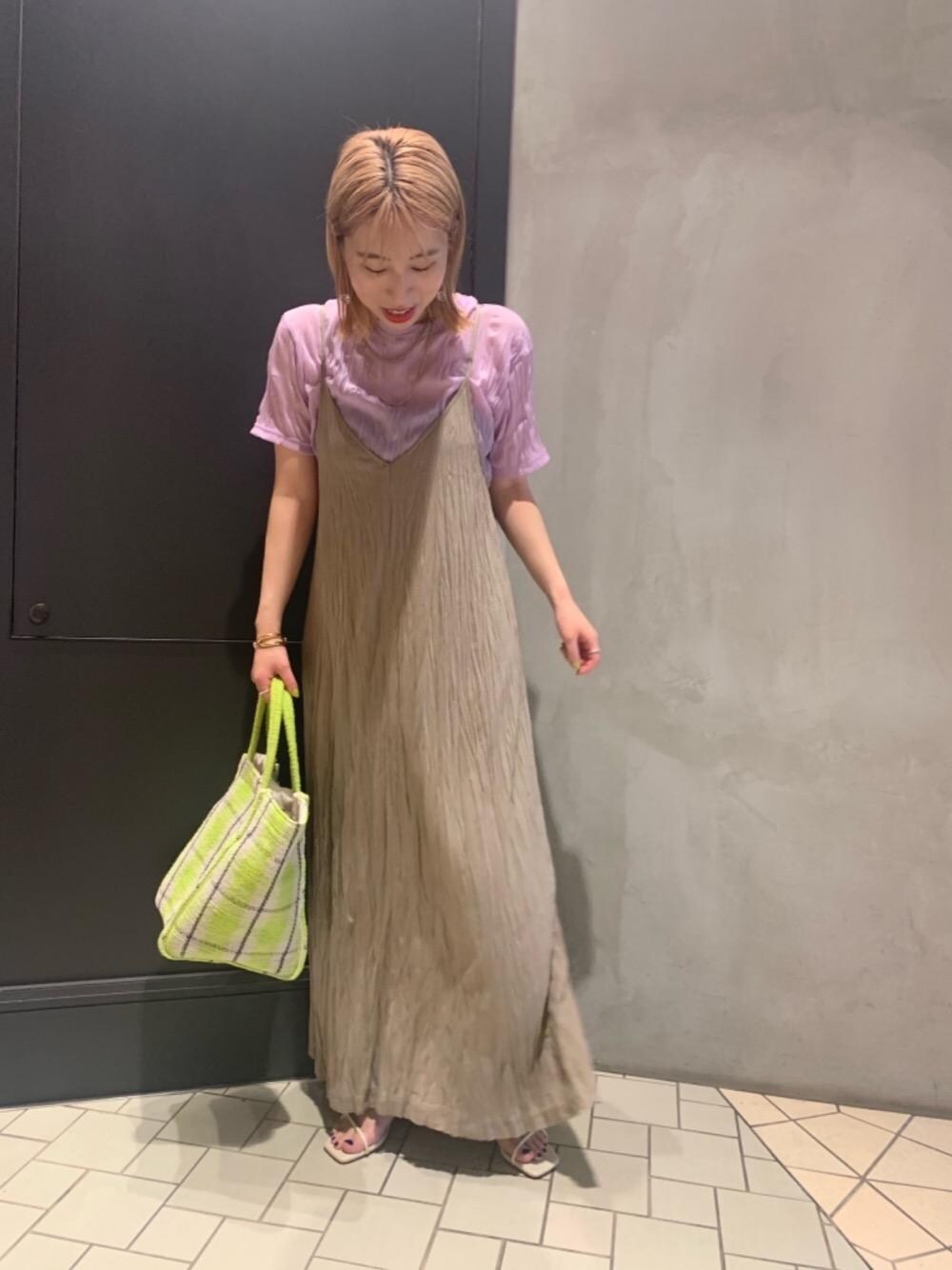 身長:161cm 普段サイズ:トップス M/ボトムス M/シューズ 23.5cm 【サイズ感】 トップス:ゆるめ ボトムス:ゆるめ シューズ:標準的 【素材感】 トップス:さらっと ボトムス:さらっと 【着心地】 軽め 【コーディネートポイント】 リラックス感あるワンピースとTシャツを組み合わせました。ワンピースをベーシックカラーにし、トップスとバッグでピンクとライムを合わせる事で涼しげな印象を演出してみました。