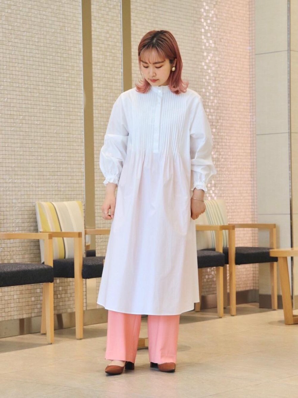 ハリのある生地のフリルワンピースはレイヤードしやすい丈ですので、色々な組み合わせを楽しんでいただけます!明るい色のパンツを合わせて、春らしくコーディネートしました。