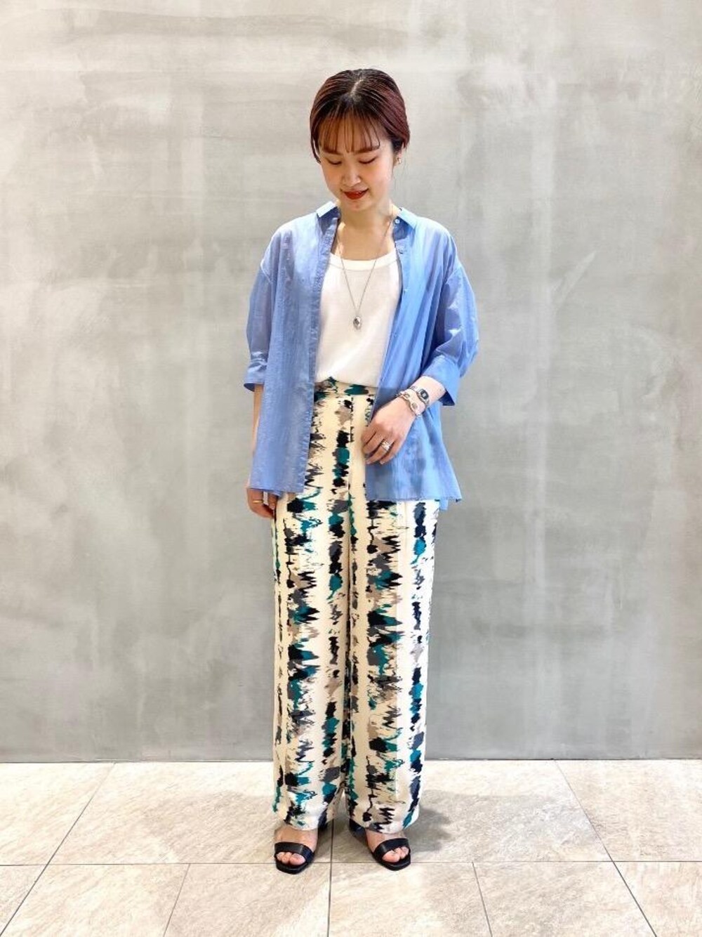 【身長】161cm 【普段】 トップス36 ボトムス38 シューズ24.5cm (37h) 【サイズ感】 トップス:ややゆったり ボトムス:ウエスト後ろがゴムで、ゆったり シューズ:普段通りのサイズ 【素材感】 トップス:ナイロン100%で透け感があります インナー:透け感あまりなし ボトムス:ポリエステル使用でとろみがあり着心地がいいです 【着心地】 トップス:サラッとしており、涼しいです ボトムス:生地がやわらかくウエスト後ろがゴムなので楽です 【コーディネートポイント】 パンツを主役に色を少なくまとめて、さわやかなコーディネートにしました。 シャツはトレンドのパフスリーブのデザインで今年らしいアイテムです。パンツも足元やトップス次第で雰囲気が変わるので着回し力抜群です! これから夏に向けて、手元のアクセサリーはシルバーで涼しげにまとめてみました♪