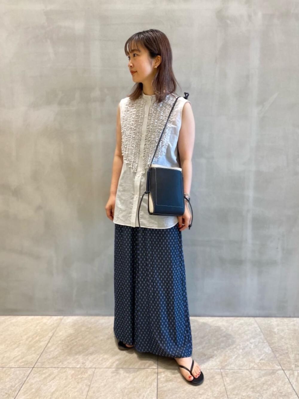 年齢:20代後半 ・身長:161cm ・普段サイズ:トップス36/ボトム38/シューズ 24.5cm(37hー 【サイズ感】 トップス:標準的 パンツ:ウエスト全体がゴムでゆったりめ シューズ:標準的 【素材感】【着心地】 トップス:リネン特有の生地で涼しいです。アームホールが広いのでインナーは必須です! パンツ:とろみがある生地でリラックスして着用いただけます。 【コーディネートポイント】 ユナイテッドアローズオリジナルプリントの小紋柄を主役に、白のブラウスと〈TKEES〉のサンダルで夏らしく爽やかなスタイリングにしました!バッグも最低限の持ち物が入るサイズなのでお出かけにピッタリでオススメです。